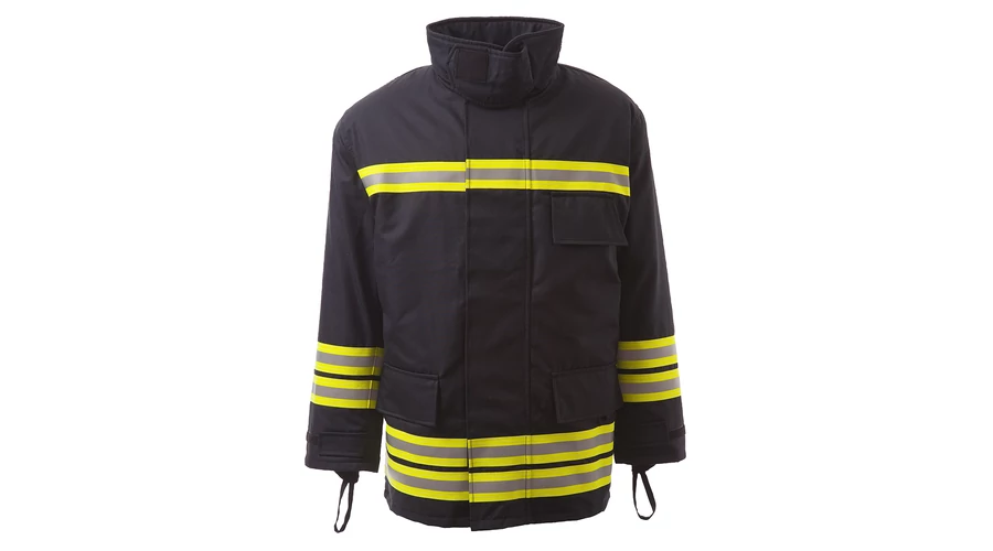 Kabát modell nagy teljesítményű Nomex® / Lenzing® anyagból. Gyorskioldó zippzárral patentos tárolózsebekkel kötött mandzsetákkal készül., Elvezető szegély, CE minősítés, Belső bordázott mandzsetták, Gyorskioldó zippzár, Rádiótartó zseb, Komfort nyakrész, Tépőzáras állítható mandzsetta , Lángálló ipari mosásra alkalmas szalag, Készlet része, CE-CAT III , Kötött mandzsetta ujjnyílással