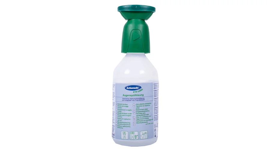 Steril szemkimosó palack 0.9%-os nátrium-klorid oldattal, idegen testek, pl. fa- és fémforgácsok, por, szennyeződések kiöblítésére. Ergonomikus öblítőfejjel és porvédővel. Megfelel a DIN EN 15 154-4 szabványnak. Mobil használatra vagy állomások és tartók feltöltésére is. Öblítési idő: kb. 2.5 perc. Eltarthatóság: 3 év.
