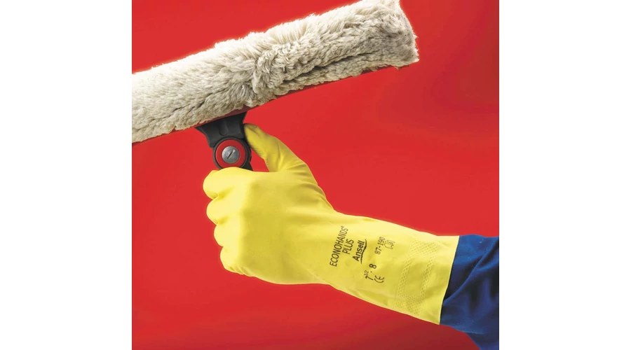 Háztartási munkákra alkalmas, 0,35 mm vastag, természetes latexből készült sárga kesztyű, belül velúrkikészítéssel. Teljes hossza: 30,5 cm.