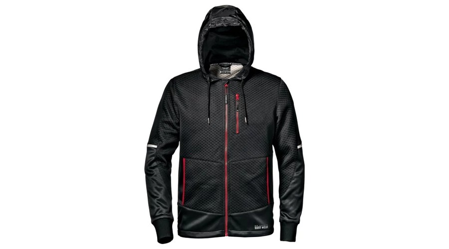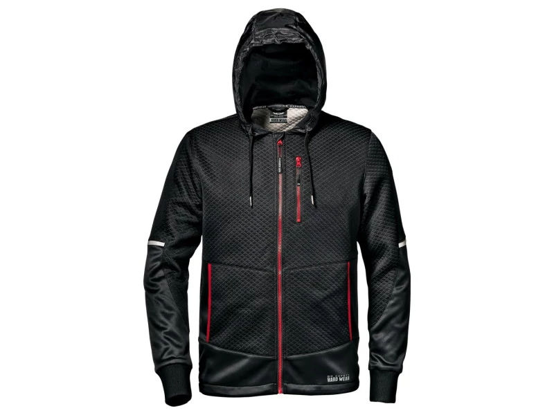Jacquard kötött anyagból készült melegítőfelső. Két elasztikus szegélyű muffzsebbel, cipzáras mellzsebbel, túlméretezett csomósodásgátló mandzsettával, bélelt nylon szélálló kapucnival és fényvisszaverővel.