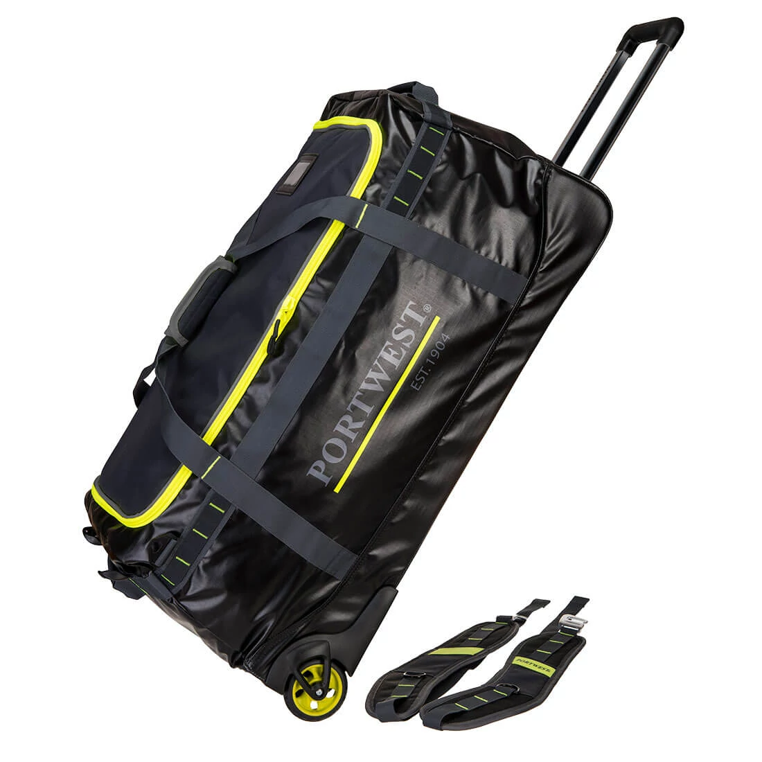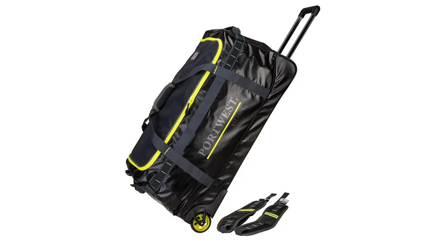 A 100 literes Duffle táska egy rendkívül időjárásálló táska, amely tökéletesen alkalmas utazásokra. A stabil kerekek és a teleszkópos fogantyú zökkenőmentes működést biztosítanak. A B951 szuper tartós, 600 Denier poliészter téphetetlen anyagból készült, TPU fóliaval borított, bombaerős védelmet nyújt minden felszerelésednek, ruhádnak, munkacsizmádnak vagy szerszámodnak.