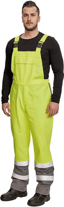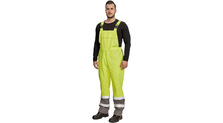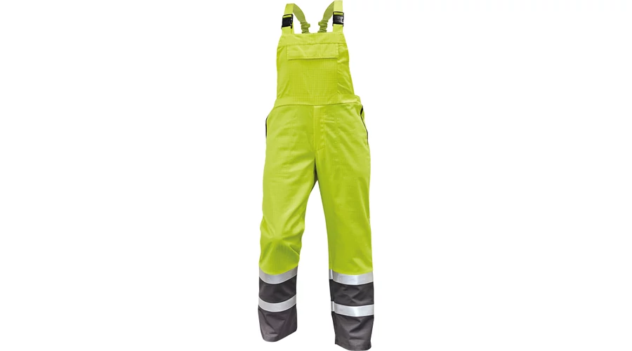 Alapanyaga korlátozott lángterjedésű antisztatikus szövet, ezért robbanásveszélyes helyen és gyúlékony anyagok közelében is használható. Használhatják hő hatásásnak kitett dolgozók, továbbá, alapanyaga megfelel a jó láthatósági követelményeknek, ezért nappali és éjszakai munkavégzésnél is használható. Zsebfedős mellzseb; 1-1 zseb derékvonal alatt; jobb száron combzseb, zsebfedővel; zsebfedős farzsebek; gumírozott derékrész; fényvisszaverő csíkok térdvonal alatt