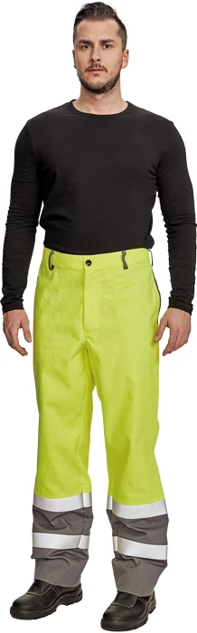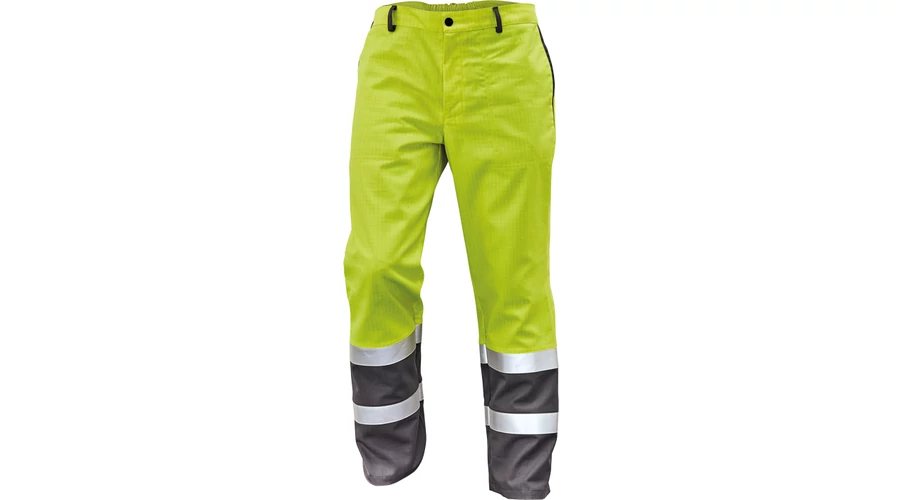 Alapanyaga korlátozott lángterjedésű antisztatikus szövet, ezért robbanásveszélyes helyen és gyúlékony anyagok közelében is használható. Használhatják hő hatásásnak kitett dolgozók, továbbá, alapanyaga megfelel a jó láthatósági követelményeknek, ezért nappali és éjszakai munkavégzésnél is használható. 1-1 zseb derékvonal alatt; jobb száron combzseb, zsebfedővel; zsebfedős farzsebek; gumírozott derékrész; fényvisszaverő csíkok térdvonal alatt; övbújtató