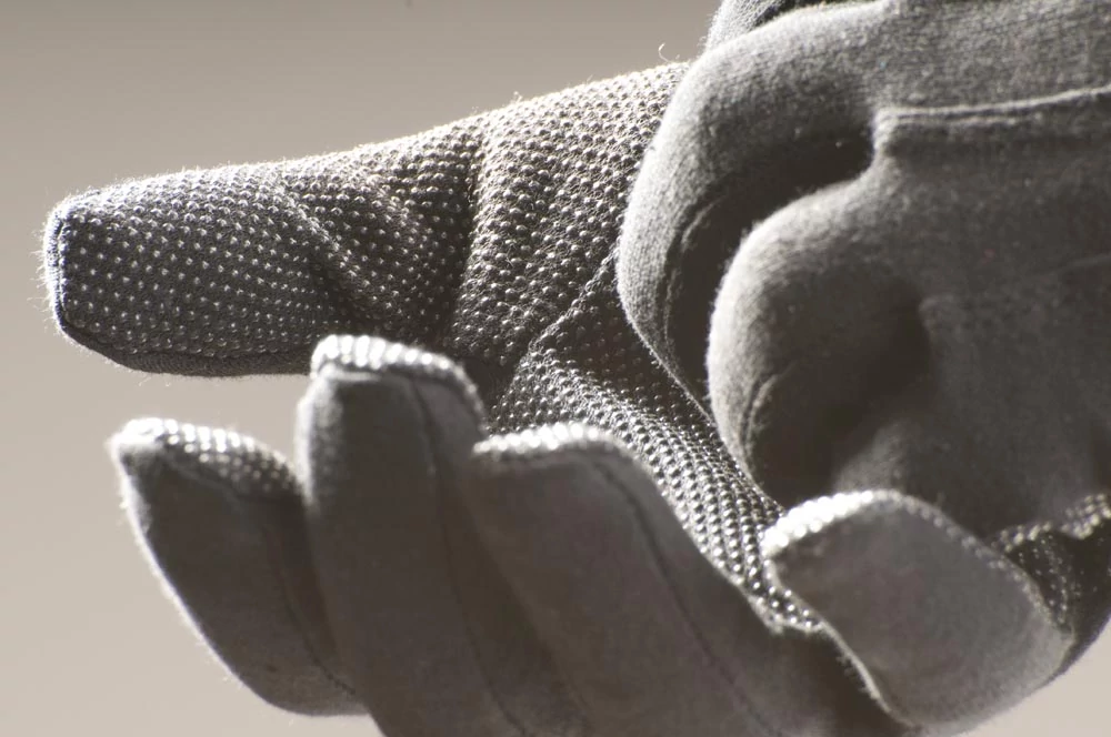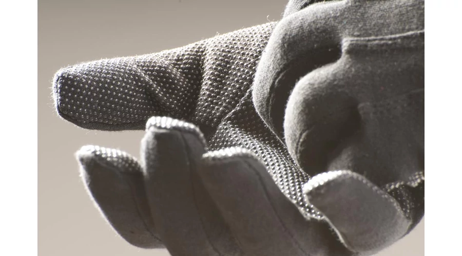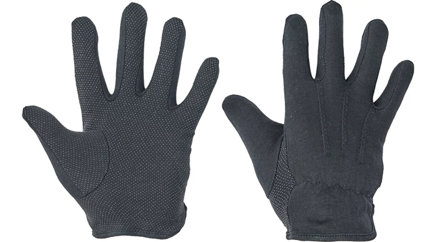 Kötött pamutkelméből varrt, mandzsetta nélküli kesztyű PVC-vel pontozott tenyérrel és ujjakkal, valamint rugalmas szalaggal a csukló felső részén.