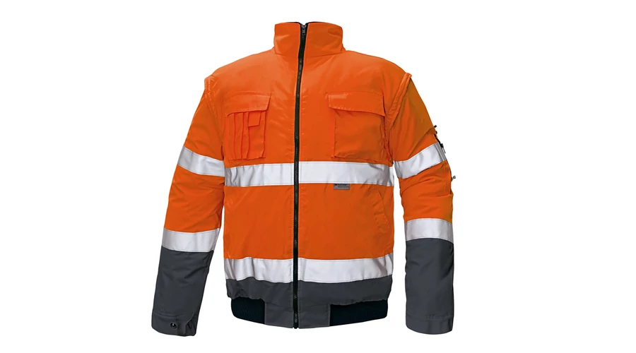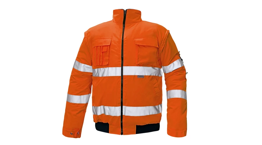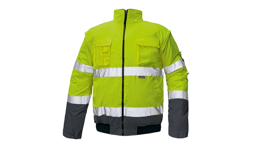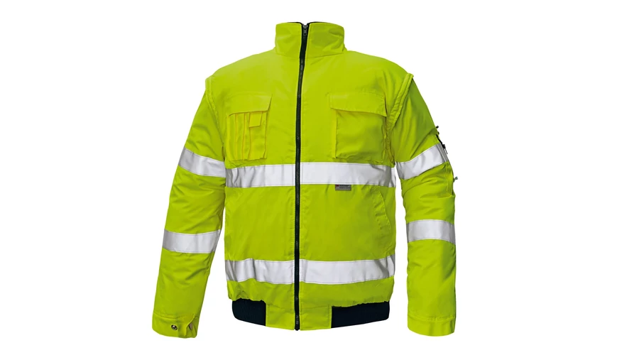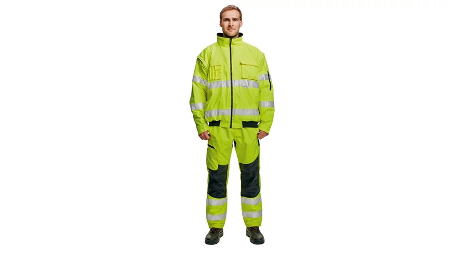 Vízhatlan jólláthatósági dzseki az EN 471 szabványnak megfelelő láthatósággal, 3M fényvisszavető csíkokkal, levehető ujjal, rugalmas derékkal, leragasztott varratokkal, az EN 343 szabvány szerinti 3. osztályú vízállósággal és az EN 343 szabvány szerinti 1. osztályú páraáteresztő képességgel.