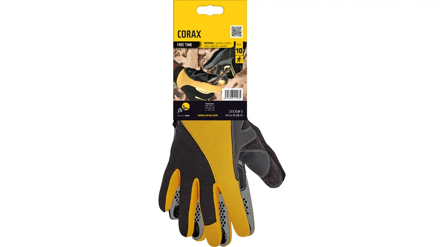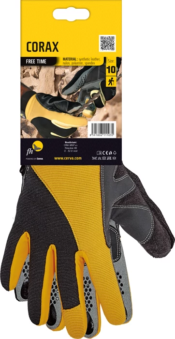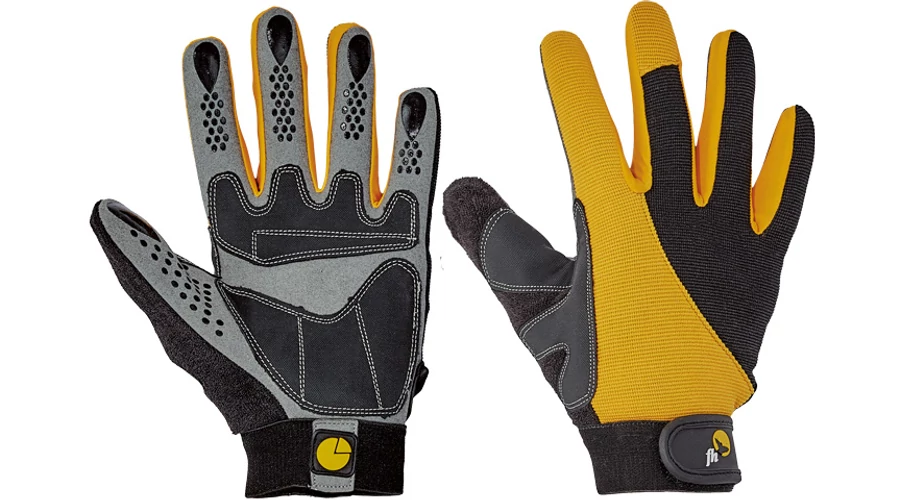 Finom hasított bőr tulajdonságaival rendelkező szintetikus anyagból varrt kesztyű csúszásgátló felületű ujjakkal, erősített tenyérrésszel, könnyű mozgást biztosító finom nylonszövettel az ujjak oldalán és tépőzárral állítható mandzsettával.