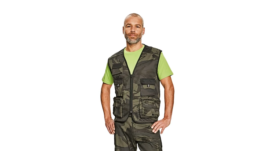 - könnyű férfi mellény kevertszálas sávoly szövetből - hálós béléssel - 11 különböző funkcionális zsebbel - cipzáras kivitelben - terepszínű árnyalatokban