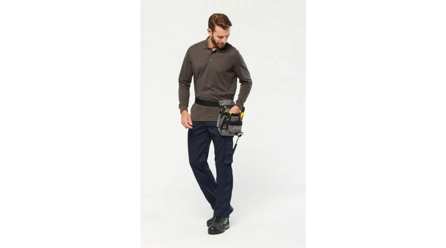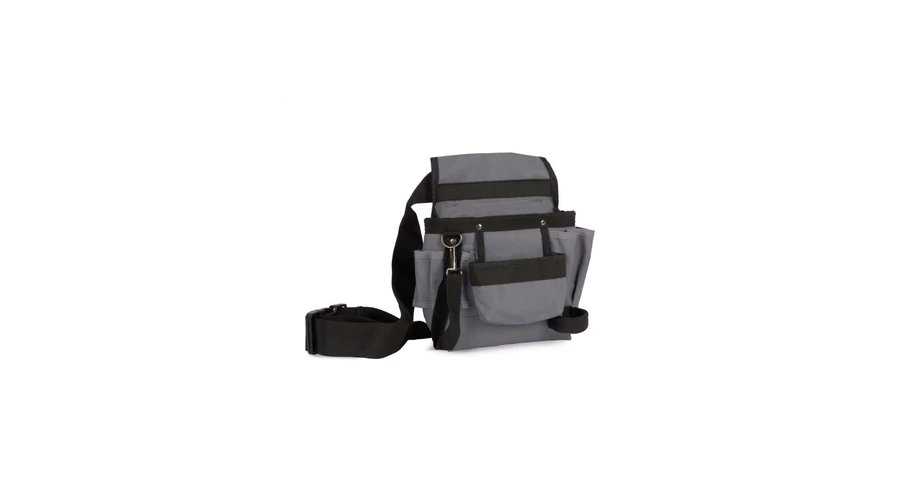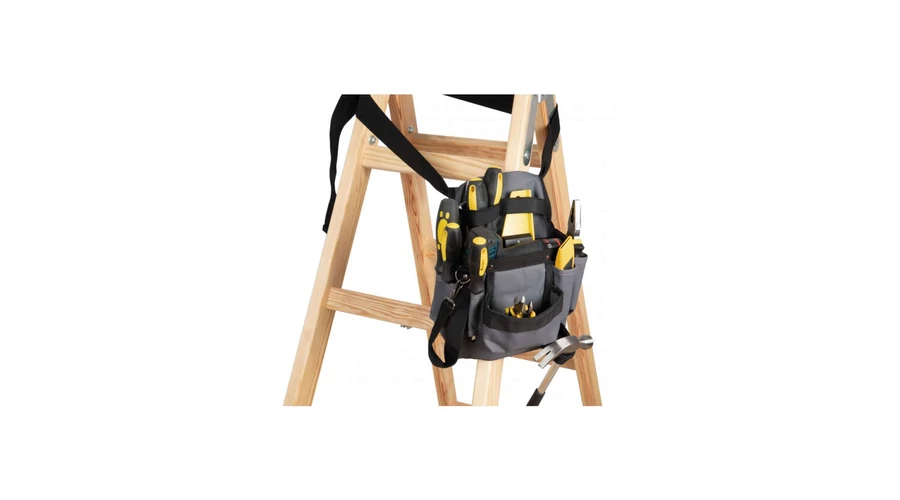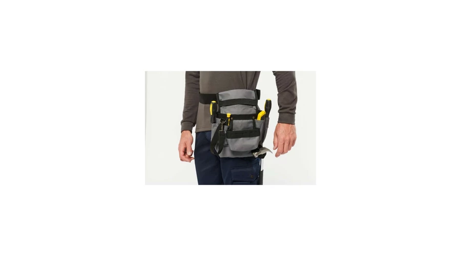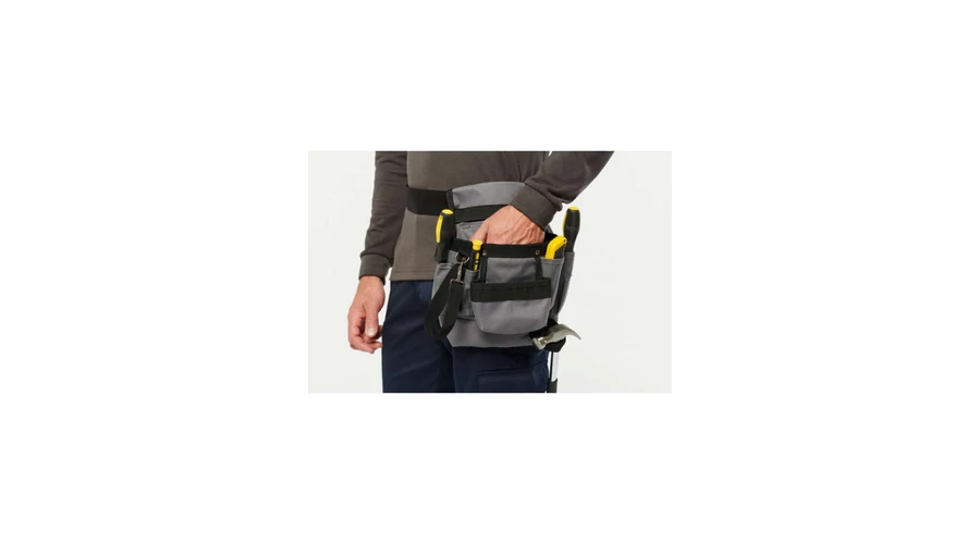 100% polyester;Tool sleeve with 8compartments and an adhesive tape holder;Adjustable belt with buckle is included;Open front pocket with easy decoration access;
