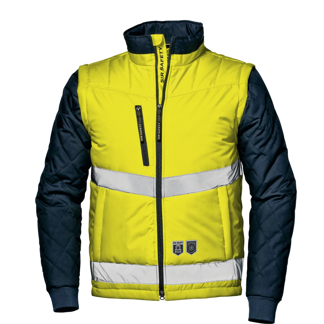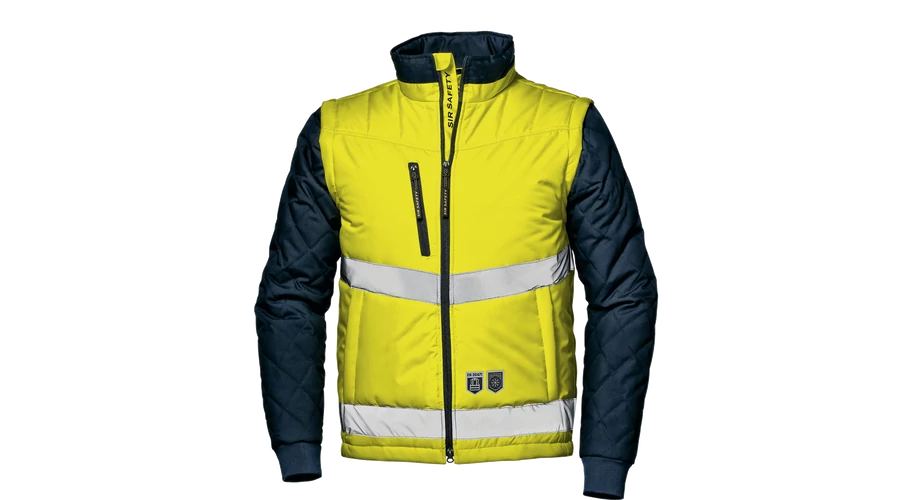 150D Oxford alapanyagból készült, vízlepergető PU laminált, pilótadzseki. Összetétel 80% poliészter, 20% pamut. 180gr/m2 bélés. Két irányű cipzáras záródás. Kontrasztos színű gallér. Két első zseb gombos záródással. Függőleges cipzáras mellzseb. Cipzárral lecsatolható ujjak. 100% poliészter mandzsetta. Tépőzáras belső zseb. EN ISO 20471 Class 2