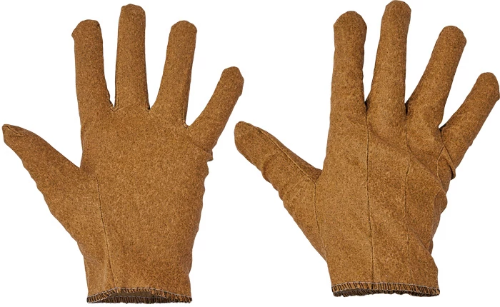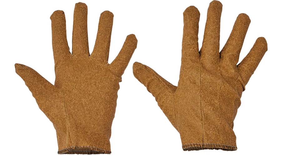 Kötött pamutkelméből varrt, vinil bevonatú bézs kesztyű.