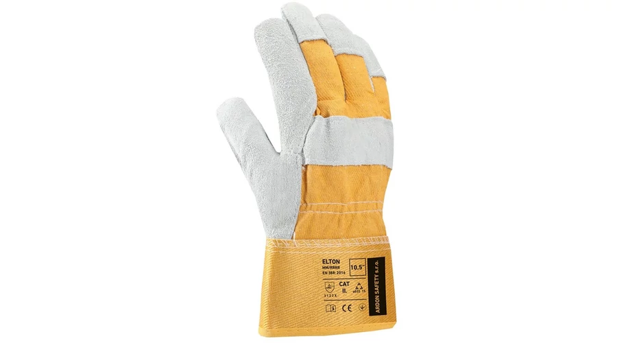 ELTON MARHABŐRKESZTYŰ Alapanyag: bőr/textil Erősített bőrkesztyű. Hátoldalán sárga pamut anyagból, gumírozott csuklórész. Méret: XL/10 Karton mennyiség:72 pár. Csomag mennyiség:12 pár