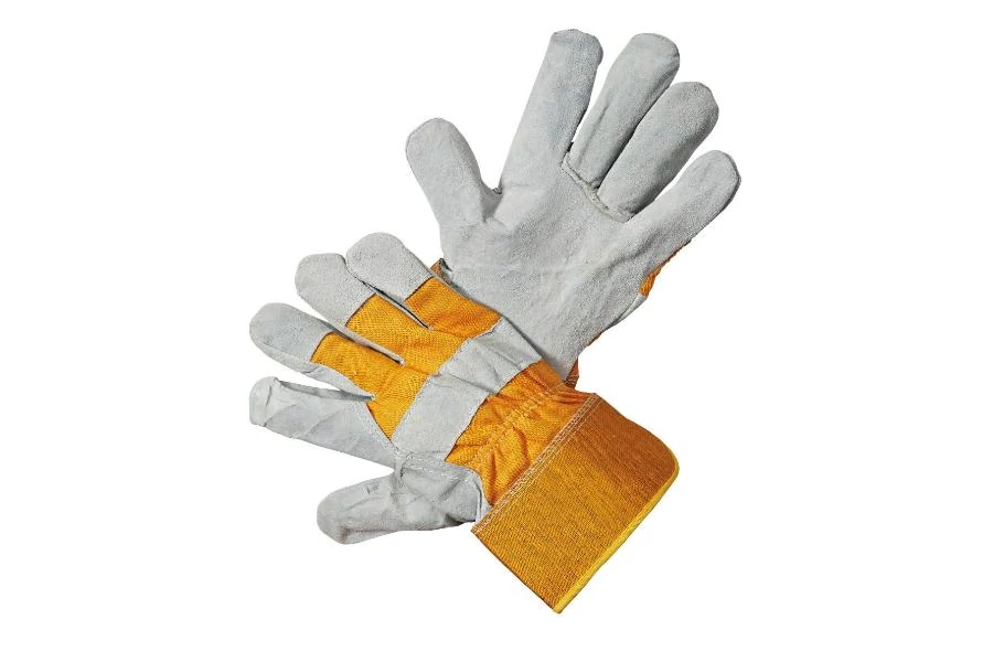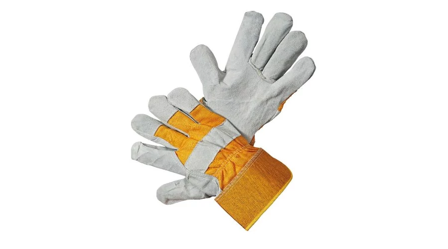 Egyetlen darab hasított marhabőrből készült védőkesztyű, bélelt tenyér, textil kézhát és mandzsetta, hüvelykujj és körömvédő bőrből.