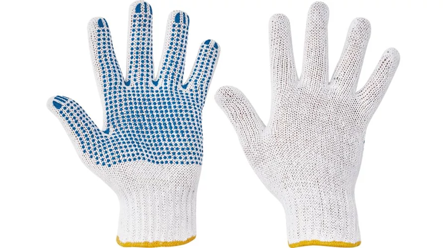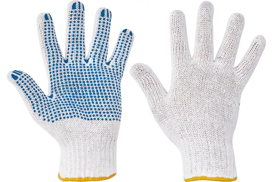 Poliészter/pamut keverékből készült, varratmentes kötött kesztyű PVC-vel pontozott tenyérrel és ujjakkal