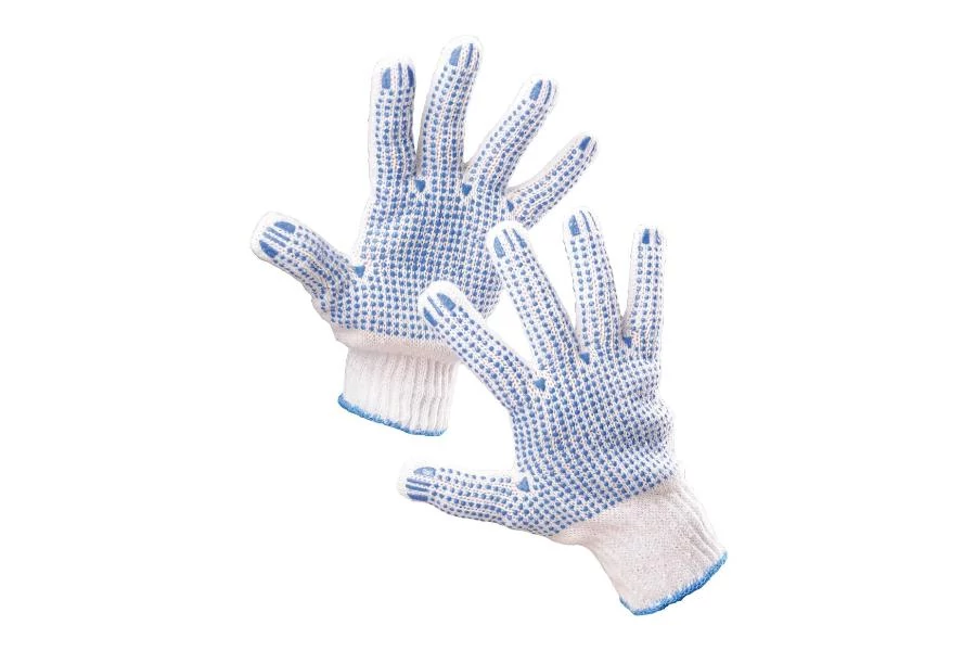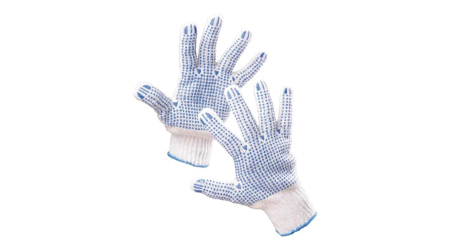 Kötött kevertszálas (PES/pamut) védőkesztyű, PVC pöttyökkel mindkét oldalán
