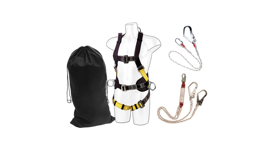 -2 pontos testheveder-Rögzítőkötél karabinerrel és acélzárral-Dupla végű energiaelnyelő karabinerrel és 2 acélzárral-Húzózsinóros zsák, CE minősítés