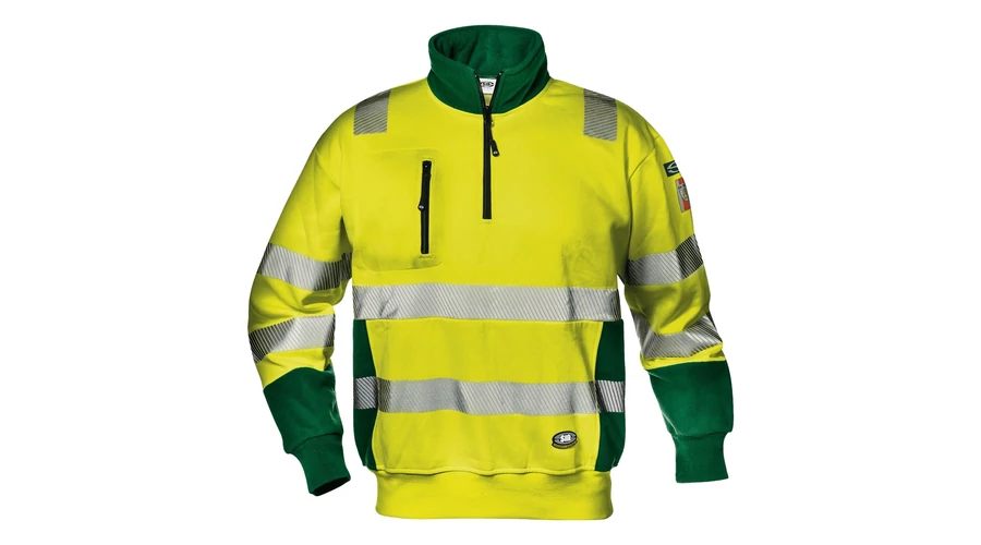 Jól látható pulóver plüss anyagból, magas gallér cipzárral, rugalmas kötött mandzsetta és derékpánttal és mellkasi zseb cipzárral. Megfelel az EU 2016/425 rendeletnek és az azt követő módosításoknak. EN ISO 20471