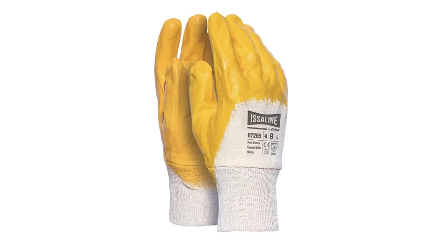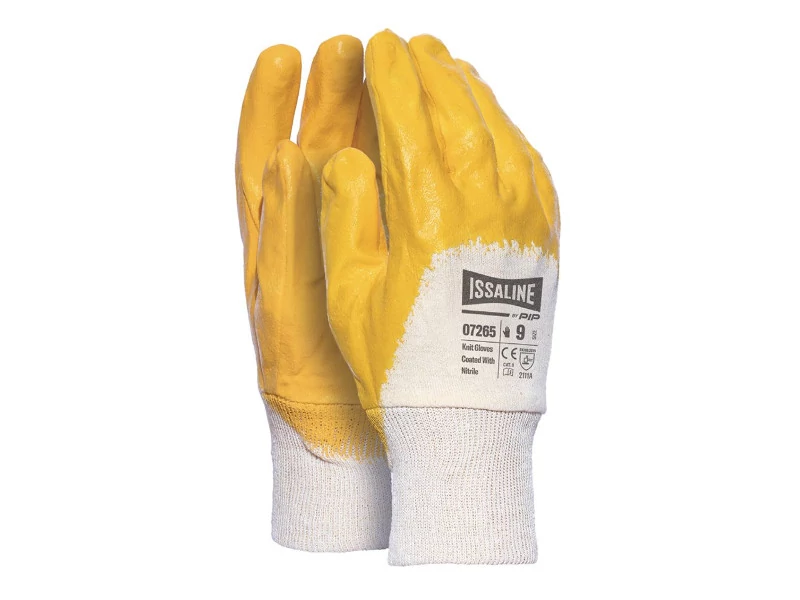 ISSALINE nitril mártott munkavédelmi kesztyű – Ez a légáteresztő kézhátú, kötött mandzsettával ellátott kesztyű ideális választás könnyű és közepesen nehéz munkákhoz. A sárga nitril bevonat jó tapadást és olajállóságot biztosít, míg a világos bézs alapszínű textil kellemes viseletet garantál.