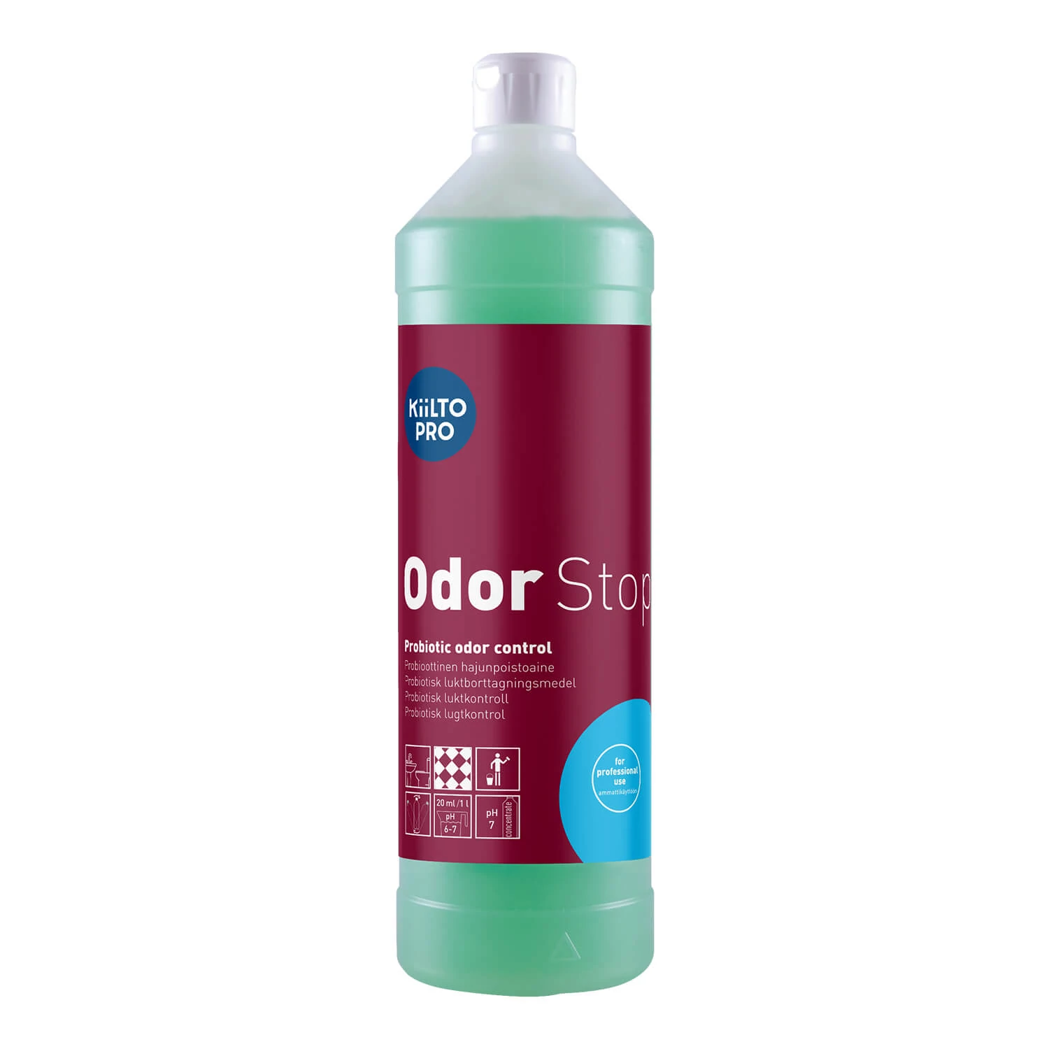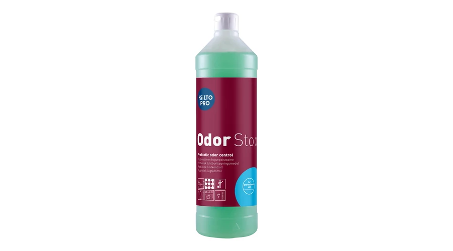 Az Odor Stop egy biológiai eredetű szagsemlegesítő készítmény. A termék erős bakteriális mikrobákon alapul, melyek segítségével nem csak elfedi, hanem véglegesen meg is szünteti a kellemetlen szagok forrását. A termékben inaktív állapotú mikrobák használat során a szennyeződésre jutva aktiválódnak és megkezdik a szerves anyagok lebontását. A mikrobák természete miatt a hatás használat után legalább 12 órával érezhető. Rendszeres használat esetén megakadályozzák a kellemetlen szagok visszatérését. Teljesen biológiai eredetű, így használata biztonságos mind emberre, mind a környezetre nézve. Kellemesen, enyhén illatosított. A Kiilto Pro Odor Stop szagsemlegesítő hatékony megoldás a különösen kitett helyek számára, mint az egészségügyi intézmények, ápoló otthonok, állatorvosi rendelők, tömegközlekedési- és szállítmányozási területek, iskolák, közterületek, szállodák, váróterek, parkolóházak, edzőtermek, sportszerek, állati eredetű szagok, hulladéktelepek, patológia, temetkezési vállalatok stb. számára. Minden felületen, még textileken, ruházaton is alkalmazható. Koncentrátum professzionális használatra.