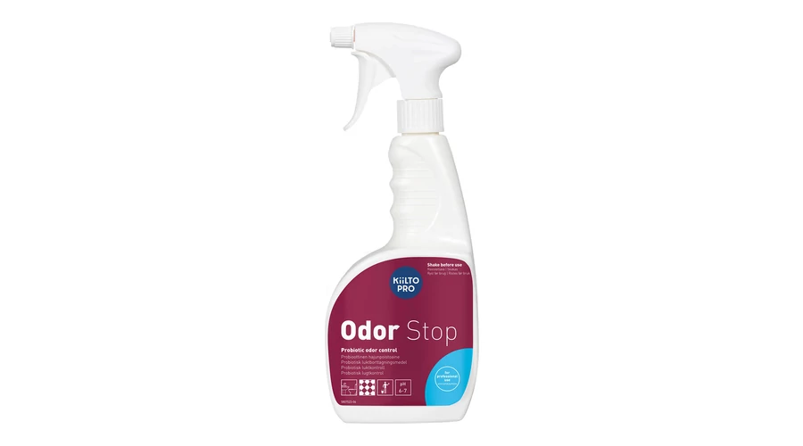 Az Odor Stop egy biológiai eredetű szagsemlegesítő készítmény. A termék erős bakteriális mikrobákon alapul, melyek segítségével nem csak elfedi, hanem véglegesen meg is szünteti a kellemetlen szagok forrását. A termékben inaktív állapotú mikrobák használat során a szennyeződésre jutva aktiválódnak és megkezdik a szerves anyagok lebontását. A mikrobák természete miatt a hatás használat után legalább 12 órával érezhető. Rendszeres használat esetén megakadályozzák a kellemetlen szagok visszatérését. Teljesen biológiai eredetű, így használata biztonságos mind emberre, mind a környezetre nézve. Kellemesen, enyhén illatosított. A Kiilto Pro Odor Stop szagsemlegesítő hatékony megoldás a különösen kitett helyek számára, mint az egészségügyi intézmények, ápoló otthonok, állatorvosi rendelők, tömegközlekedési- és szállítmányozási területek, iskolák, közterületek, szállodák, váróterek, parkolóházak, edzőtermek, sportszerek, állati eredetű szagok, hulladéktelepek, patológia, temetkezési vállalatok stb. számára. Minden felületen, még textileken, ruházaton is alkalmazható. Használatra kész, könnyen kezelhető spray.