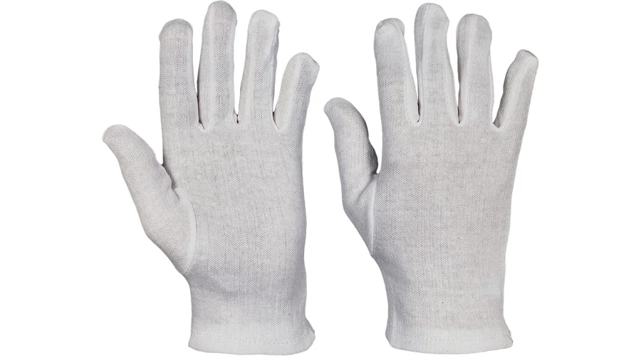 Finom fehérített kötött pamutkelméből a "fourchette" szabás szerint varrt, mandzsetta nélküli kesztyű.