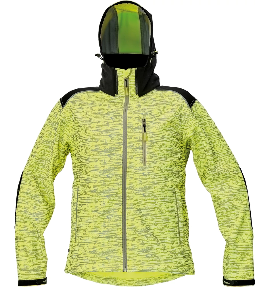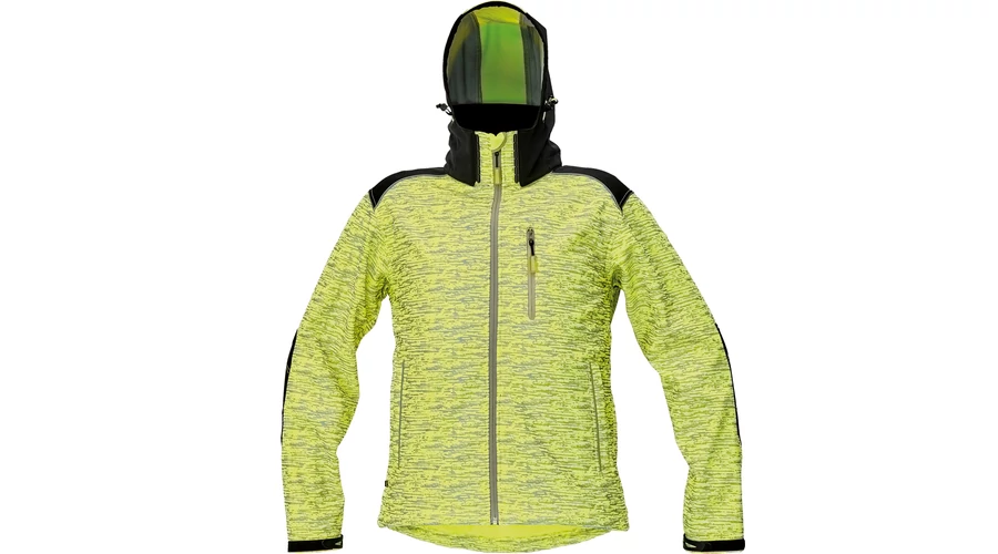 • férfi softshell kabát fényvisszavető festéssel a fluoreszkáló színű szöveten • megerősített vállak és könyökrész • 1 cipzáras mellzseb • 2 oldalzseb • állítható kapucni • a váll és a zsebek szegélye fényvisszavető • állítható kerületű ujjvégek és passzé