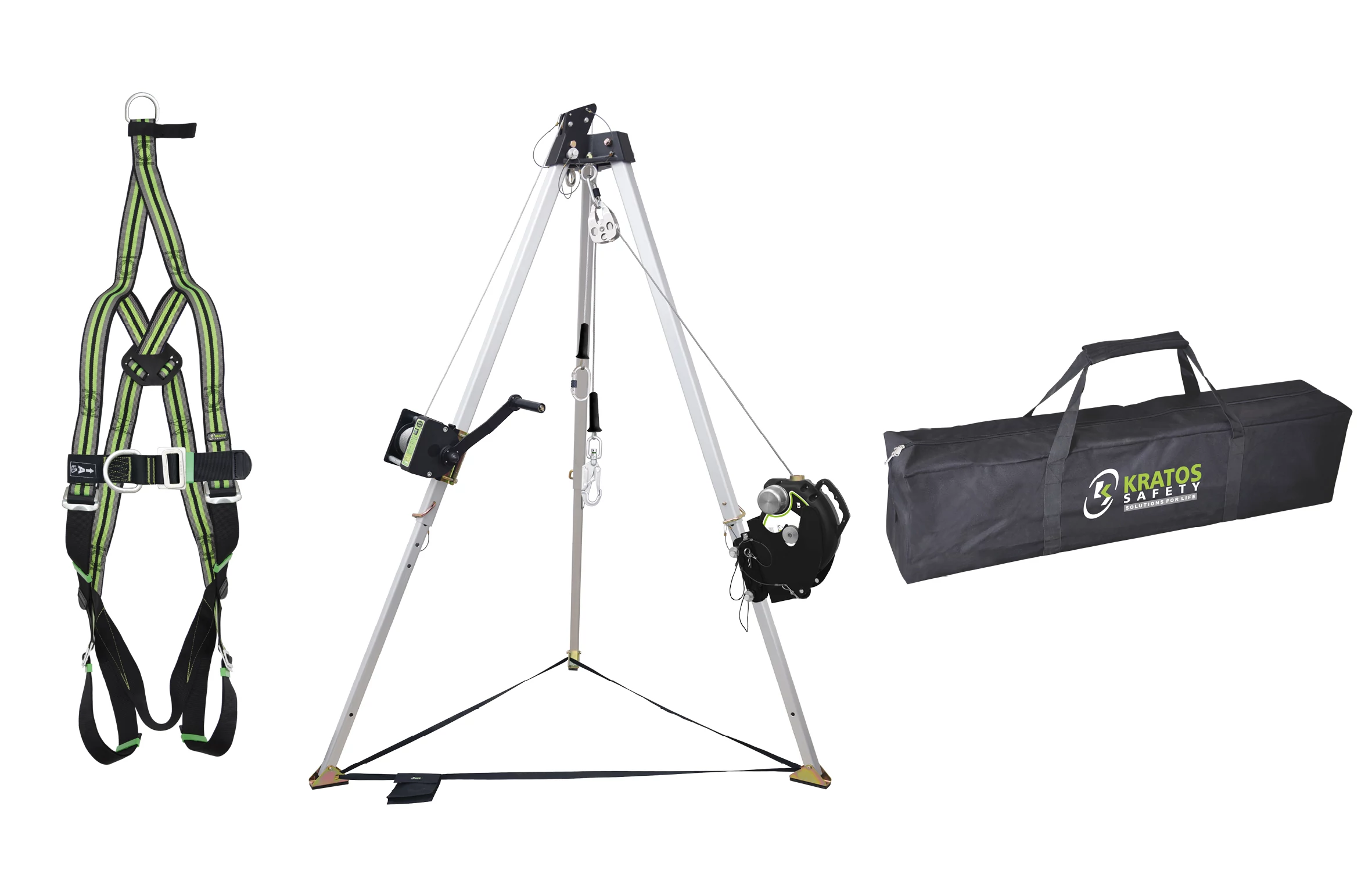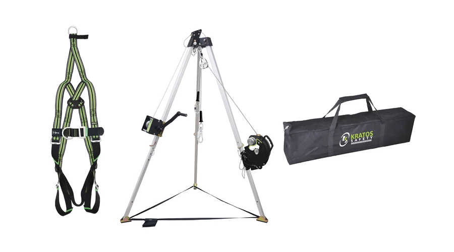 A készlet tartalmaz egy két rögzítési ponttal ellátott mentőhevedert (az EN361 szabványnak megfelelve), egy 20m hosszú Olympe visszahúzható zuhanásgátló kábelt (az EN360 és az EN1496 B szabványnak megfelelve), egy körülbelül 213cm magas, szűkhelyekhez használható állványt (az EN795 B szabványnak megfelelve), egy behúzható zuhanásgátló mentőcsörlőt, egy 250kg-ig terhelhető 20m hosszú acél drótkötelet (az EN1496 A szabványnak megfelelve), és egy táskát a készlet tárolásához és szállításához.