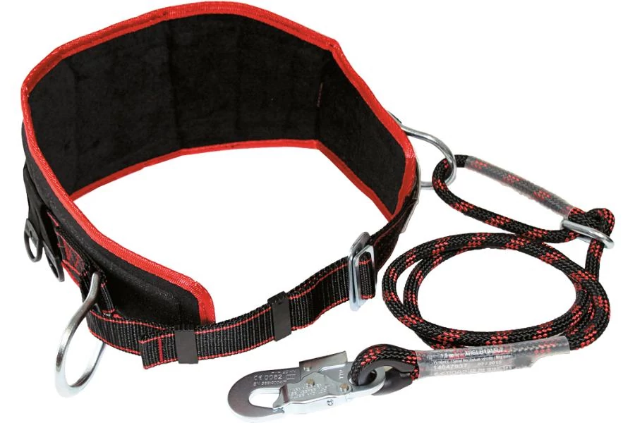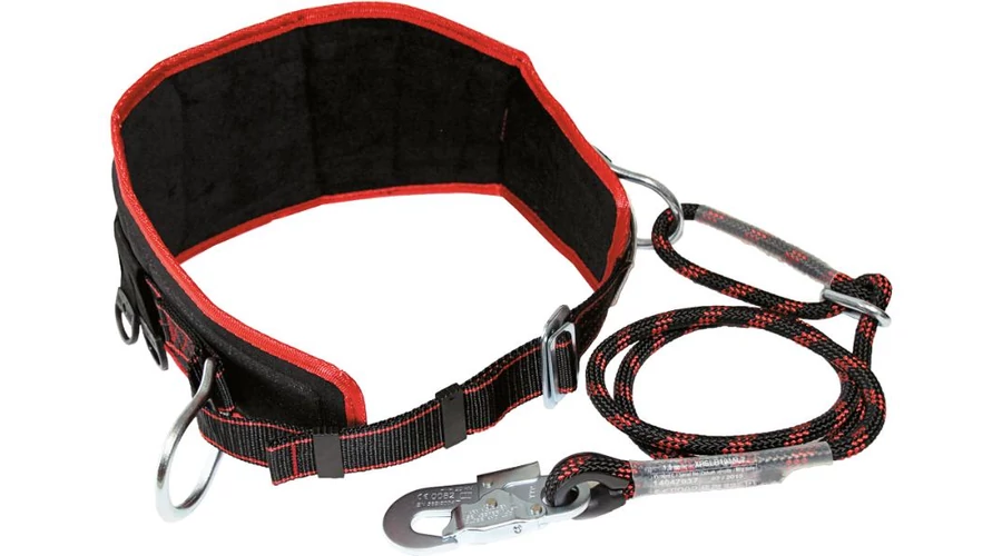 Munkahelyzet-beállító deréköv derékmerevítővel, helyzetbeállító gyűrűkkel, méretállító csattal, szerszámtartó táska felfüggesztésére szolgáló gyűrűkkel, hosszállító elemmel és záras acél karabinerrel ellátott, 1,5 m hosszú univerzális biztonsági kötéllel