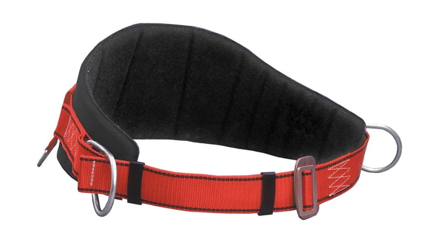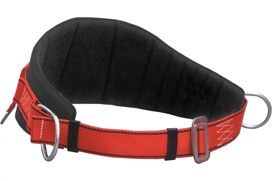 Munkahelyzet-beállító deréköv derékmerevítővel, helyzetbeállító gyűrűkkel, méretállító csattal és szerszámtartó táska felfüggesztésére szolgáló gyűrűkkel