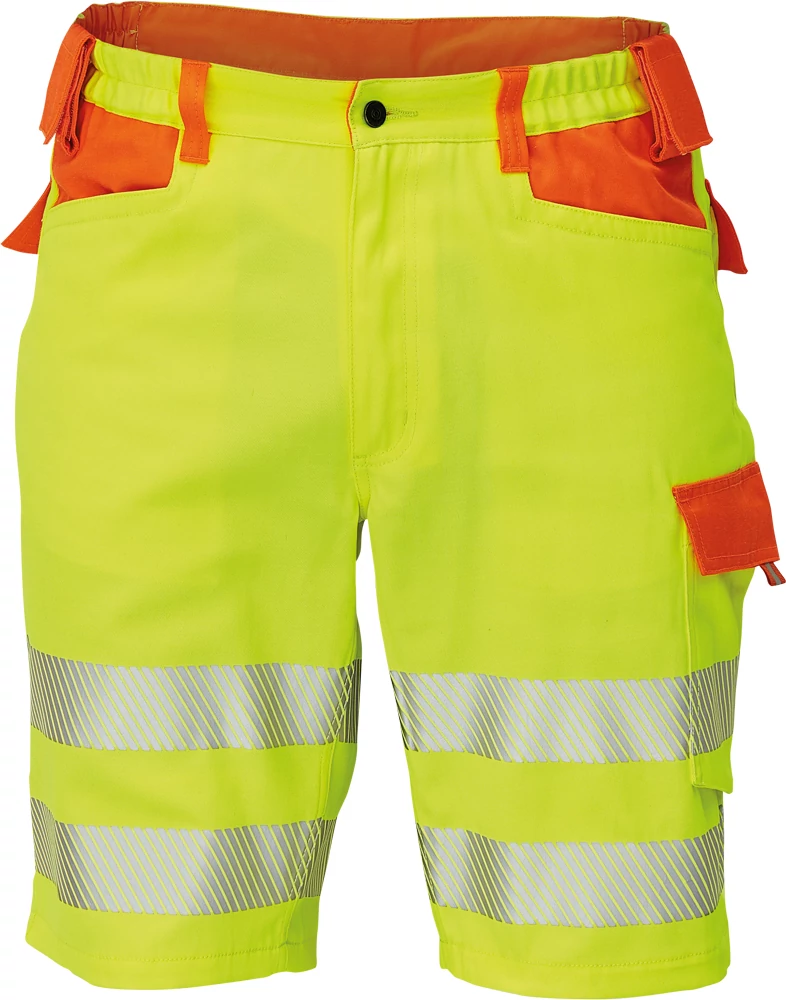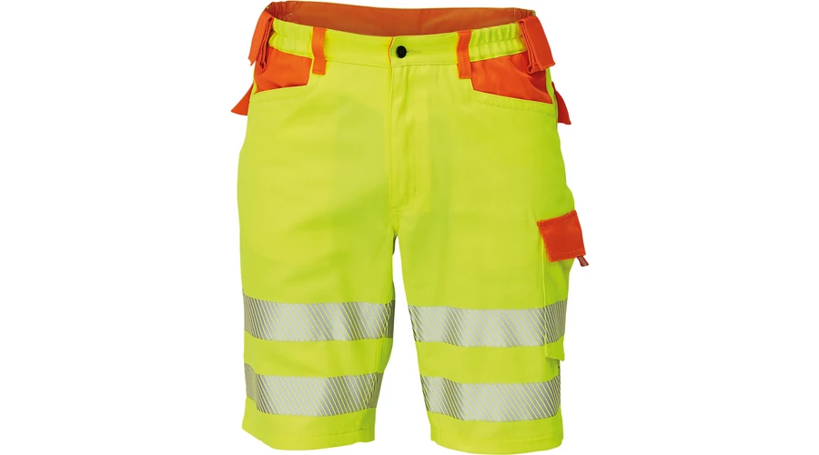 • férfi rövidnadrág két attraktív jólláthatósági szín kombinációjában fényvisszavető csíkkal • 2 nagy elülső zsebbel• 1 multifunkcionális oldalsó zseb • 2 hátsó füles zsebbel • rugalmas derék • 2 kalapácstartó