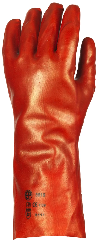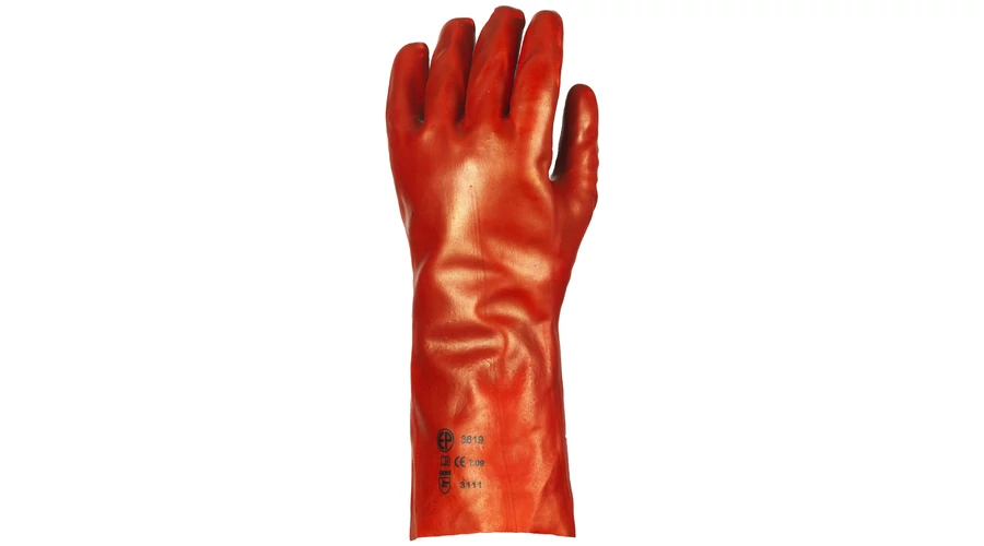 36 CM MÁRTOTT PIROS PVC ECOLINE KESZTYŰ: • pamutra mártott, nedvességálló piros PVC • 0,8 mm vastag, 36 cm hosszú védőkesztyű • Ecoline® változat • CSOMAGOLÁS: 100/10 • EU szabvány: EN420, EN388: 4121