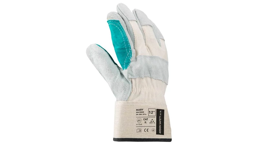 MARY MARHABŐRKESZTYŰ Alapanyag: Bőr/Textil Megerősített tenyér és mutatóujj rész, hasított bőrből. Kézhát pamut, gumírozott mandzsetta. Méret: XL/10,5 Karton mennyiség:72 pár. Csomag mennyiség:12 pár