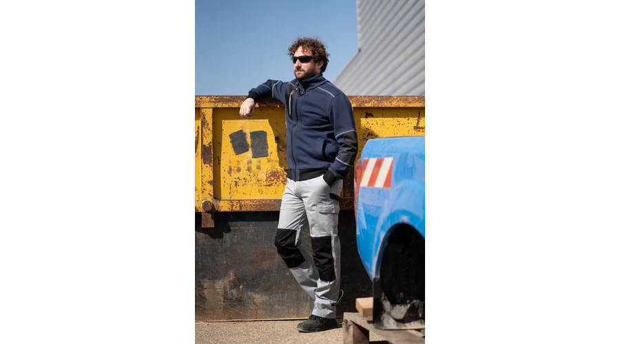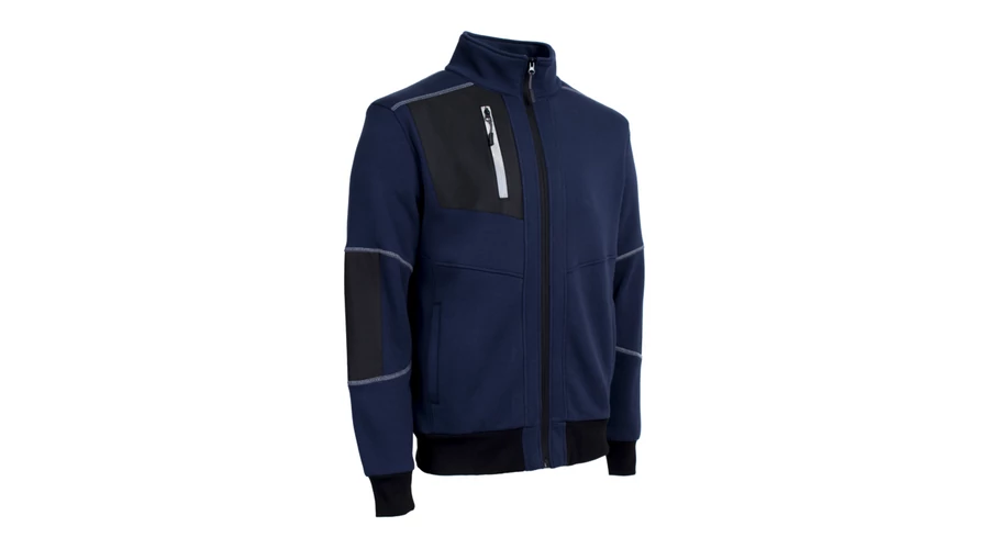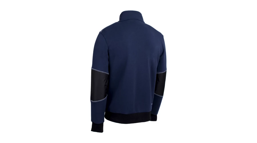 - Bolyhozott dzsörzé – Kék: 70% pamut+30% PES, szürke: 80% pamut+20% PES, - 300 g/m2 vastag - PASSZÉ: bordázott és elasztikus 100% Poliészter - RIPSTOP BETÉT: (5 mm) PVC-vel borított 100% PES - 300 g/m2 - Kopásálló Ripstop betétek a vállon - Álló gallér - Cipzáras záródás - 1 cipzáras softshell felső zseb - 2 függőleges oldalzseb - 2 belső zseb - Bordázott textil mandzsetta és aljrész - Kopásálló Ripstop megerősítés a könyökrészen