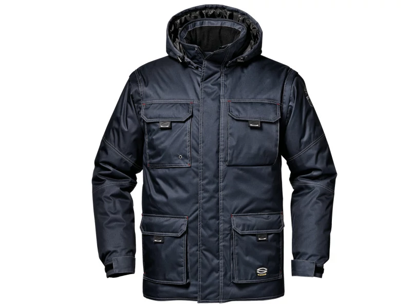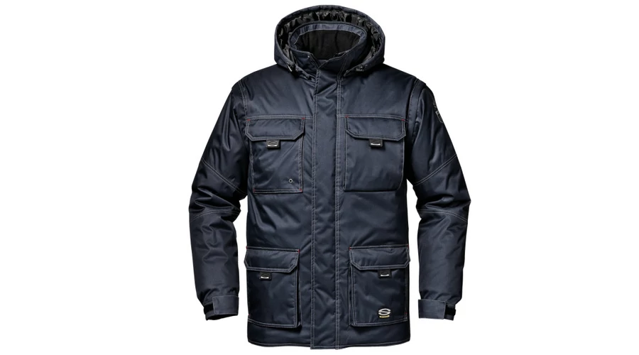 Dzseki PU bevonatú poliészter Twill anyagból, meleg és légáteresztő; rejtett cipzáros záródás pattintható gombokkal, gallérbélés és mandzsetta polár anyagból, levehető, húzózsinórral állítható, bélelt kapucni, levehető ujjak, négy háromdimenziós zseb hajtókkal és pattintható gombokkal. Univerzális zseb füllel és tépőzárral teljes nyitással, kitűzőtartóval, tolltartóval, telefonzsebbel és sok rekesszel, két belső zsebbel, oldalsó muffzsebekkel, tépőzárral állítható elasztikus mandzsetta. Belső jelvénytartóval. Megfelel az (EU) 2016/425 rendeletnek.