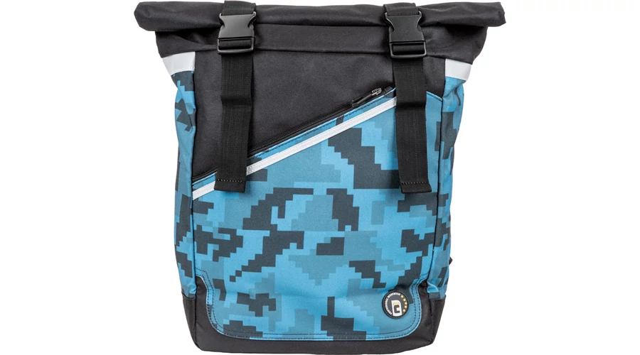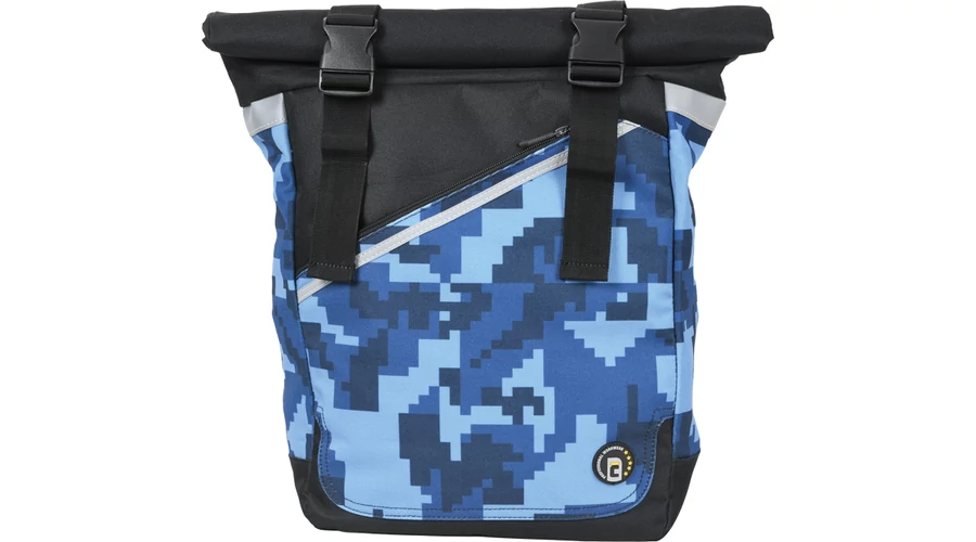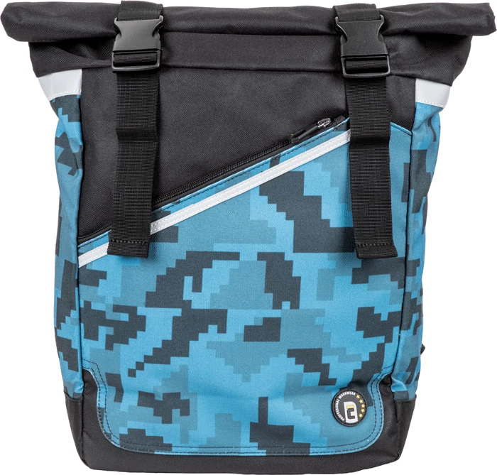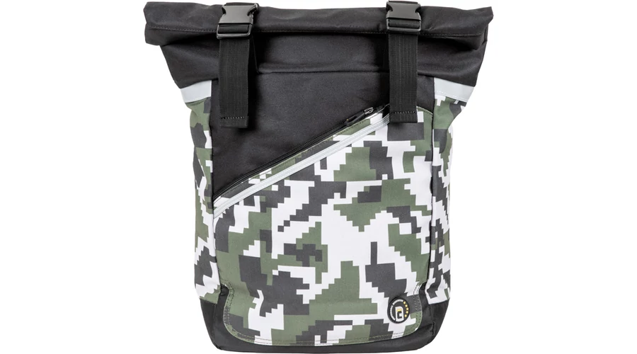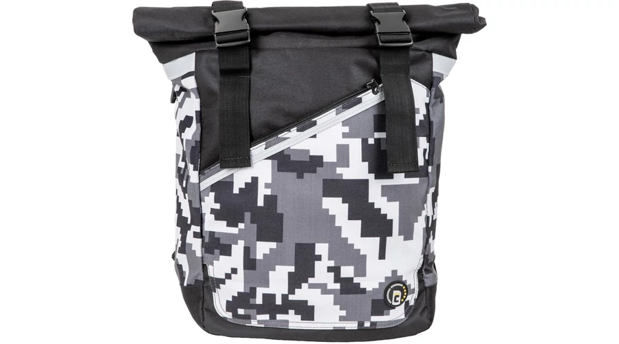 egy rekeszes hátizsák digitális terepmintával, belső rendező a laptop, telefon és pénztárca számára, párnázott hátrész és vállpántok, egyedi 2 csatos fedél