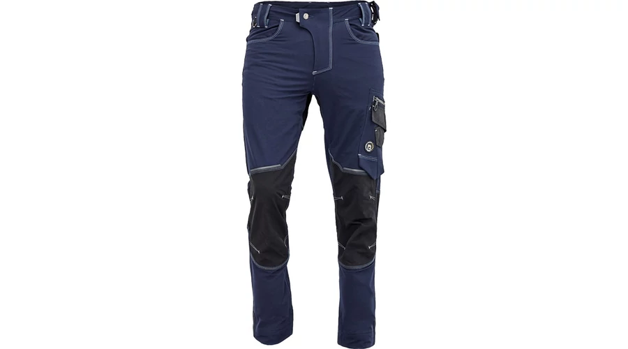 Férfi munkanadrág innovatív, rugalmas TRIFIBETEX PRO® anyagból, elöl 2 ékzseb, hátul 2 tépőzáras foltzseb, bal oldalt nagy multifunkciós zseb, jobb oldalt multifunkciós vonalzó, kés és ceruzatartó, fém "D" gyűrű, rugalmas derék, hosszabbítható szárhossz, fényvisszavető elemek, dekoratív tripla varrás kontrasztos színnel, kalapácstartó.