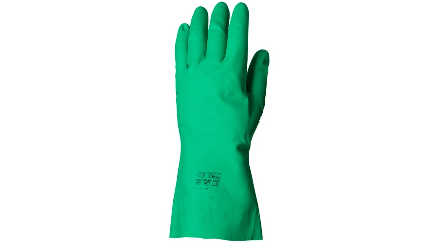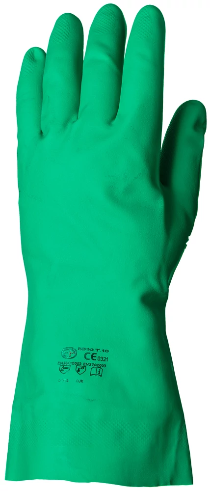 - zöld akrilonitril, pamutbolyhozott belső - sav-, lúg-, olaj-, zsír-, és vegyszerálló - mikroorganizmusok elleni védelem - csúszás ellen érdesített tenyér - 0,38 mm vastag, 32 cm hosszú EU szabvány: EN420, EN388: 4002, EN374-1, 374-2, 374-3: AJK