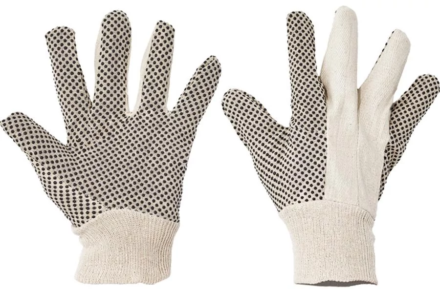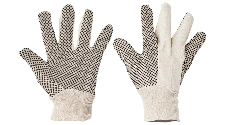 Pamutvászonból varrt kesztyű PVC-vel pontozott tenyérrel és ujjakkal, valamint rugalmas kötött mandzsettával