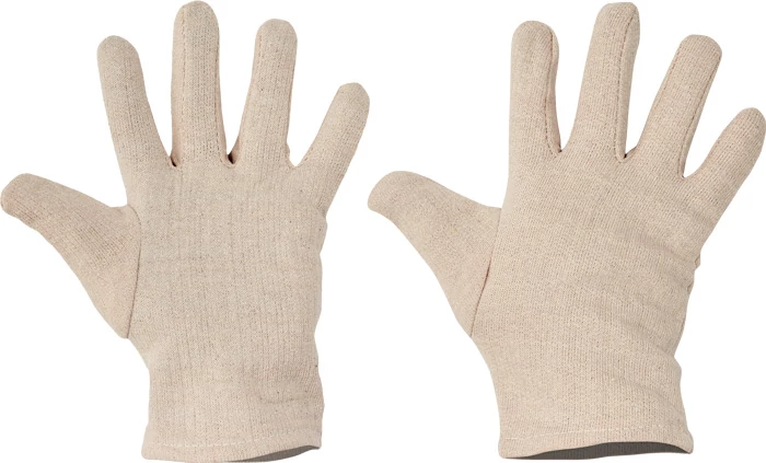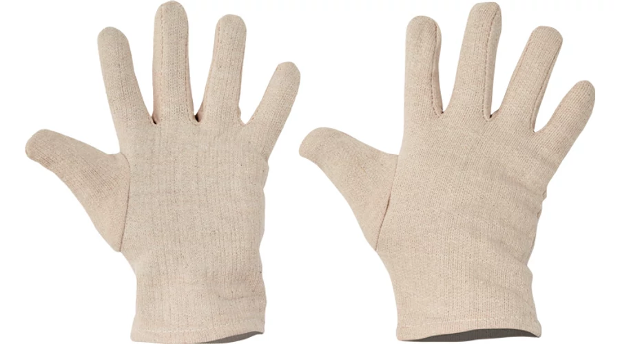 Fésült kötött pamutkelméből a "fourchette" szabás szerint varrt, mandzsetta nélküli kesztyű. Teljes hossza: 23 cm.