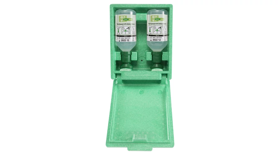 Elsősegély állomás 2 x 500 ml elsősegély szemkimosó flakon falra szerelhető dobozban