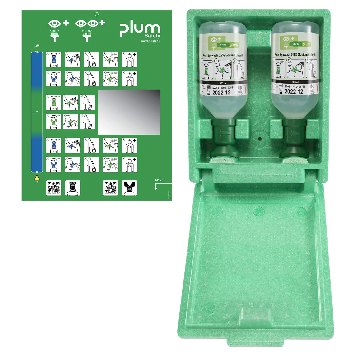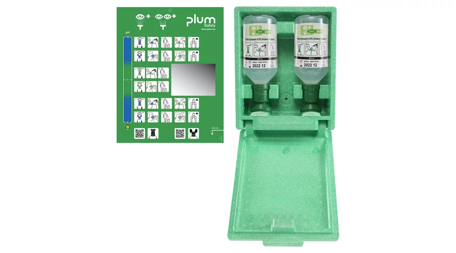 Pormentes fali szemkimosó állomás, polisztirénből, 2 x 500 ml Plum elsősegély szemkimosóval, tükörrel és piktogrammal. Kimondottan alkalmas a piszkos, poros területeken, vagy mobil munkaállomásokon. Méretek: 280 x 230 x 110 mm. A flakon 500 ml 0,9%-os steril nátrium-klorid oldatot tartalmaz. Könnyen kezelhető flakonban, ergonomikus kupakkal, porvédővel és egyértelmű használati utasítással van ellátva. Önálló használatra, vagy falra szerelhető állomások feltöltéséhez is alkalmas. Szavatossági idő: 3 év. Öblítési idő: kb 10 perc.