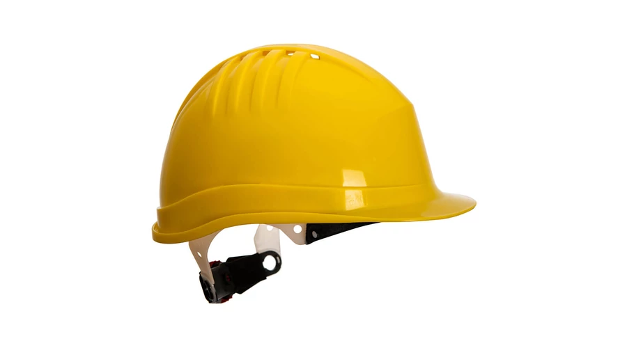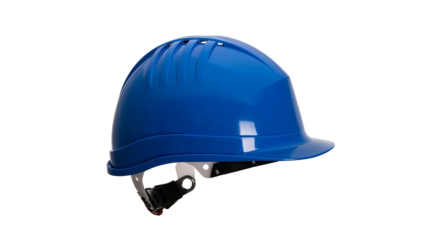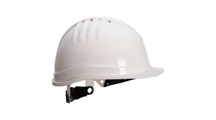 Könnyű ipari védősisak szellőzőnyílásokkal, 6 pontos műanyag hevederrel, csúszózárral a méret beállításához, szabályos csúcs, univerzális oldalsó nyílások és esőcsatorna, izzadópánt mellékelve, fokozott tarkóvédelem a hátsó héj kialakításával.