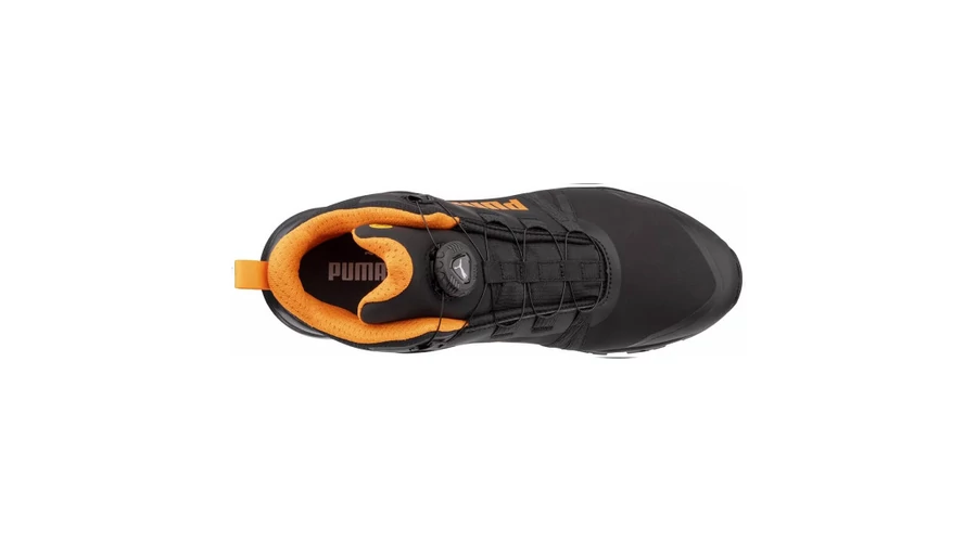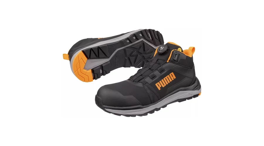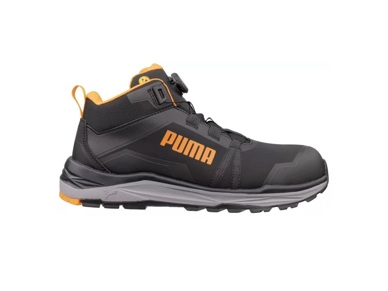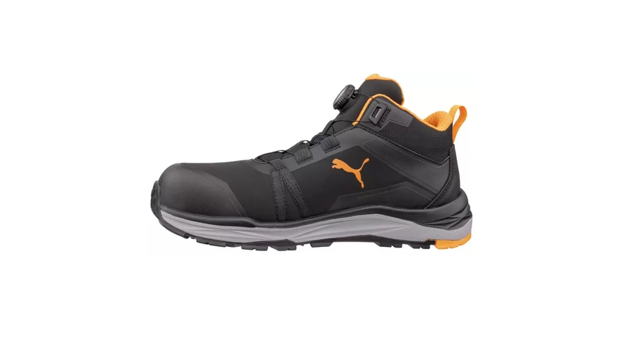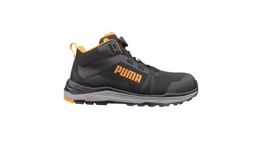 Puma KANYON Blk/Orange DISC Mid munkavédelmi bakancsA Puma KANYON Blk/Orange DISC Mid munkavédelmi bakancs S3S ESD FO HRO SR védelemmel készül, kompozit–üvegszálas orrvédelemmel és rugalmas FAP® LITE átszúrás elleni védelemmel, a PUMA DISC tekerős záródás pedig gyors, pontos illeszkedést ad a stabil tartáshoz.Főbb jellemzők:S3S ESD FO HRO SR védelmi szintKompozit–üvegszálas orrvédelem a könnyű, mégis erős védelemértFAP® LITE rugalmas átszúrás elleni védelemMikroszálas felsőrész FUSE.TEC® erősítésekkel a tartósságértPUMA DISC tekerős záródás a gyors felvételért és precíz beállításértBreathActive+ bélés a komfortos szellőzésértevercushion® RELIEF talpbetét csillapítással és alátámasztássalTRAIL PROTECT talp XTS cross-terrain gumitalppal – HRO, akár 300°C-ig hőállóIMPULSE.BLAST® középtalp az energikus, rugalmas lépéskomfortértIdeális, ha olyan gyorsan állítható, strapabíró munkavédelmi bakancsot keresel, ami jól szellőzik és kényelmesen csillapít, miközben a talpa hőálló és csúszásbiztos tapadást ad.