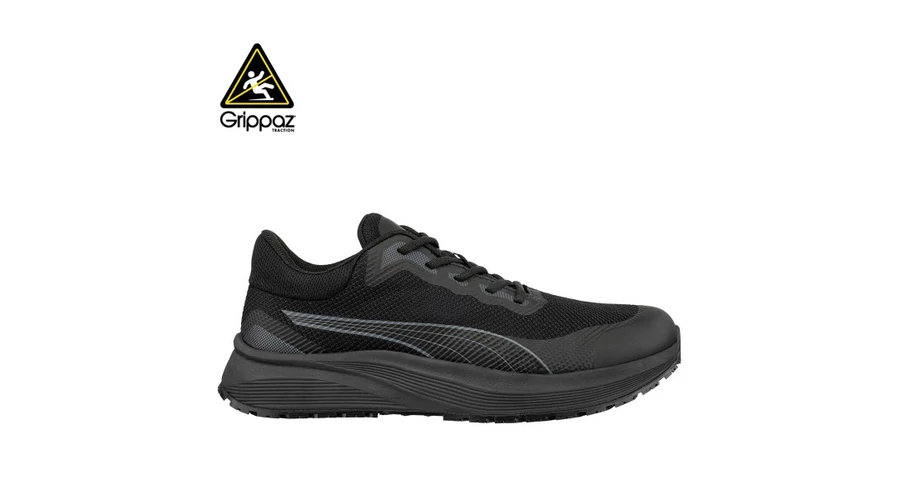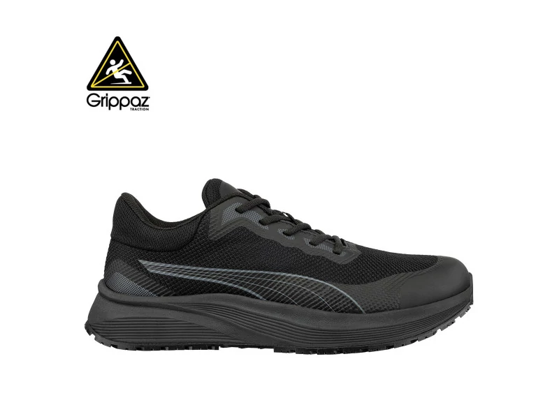 Puma Spark ST BLK Low O1 FO SR munkavédelmi cipő – A Puma Spark egy sportos, könnyű és kényelmes munkacipő, amely ideális a vendéglátásban dolgozók számára. A fémmentes konstrukció, a csillapító IMPULSE.LITE középtalp és a SPLASH GUARD membrán egész napos kényelmet biztosítanak. A futócipők ihlette, folyadékelvezető barázdákkal ellátott csúszásgátló talp kiváló tapadást nyújt, míg a légáteresztő hálós felsőrész FUSE.TEC megerősítéssel tartós és rugalmas viseletet kínál.