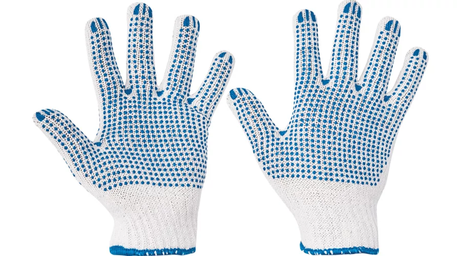 Poliészter/pamut keverékből készült, PVC-vel pontozott, varratmentes, kötött, megfordítható kesztyű rugalmas kötött mandzsettával.