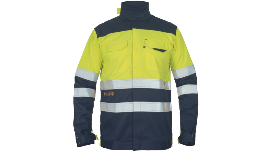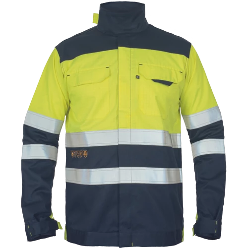 HI-VIS multinorm jacket; zipper closure with velcro flap cover; 2 chest pockets with velcro flap cover; reflective 5 cm sewn stripes around sleeves and hips; velcro adjustment on sleeves cuffs and stand-up collar.