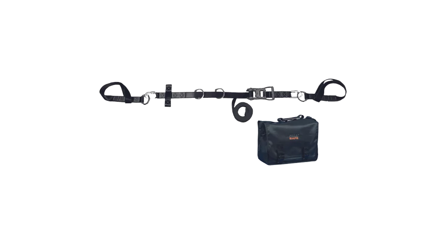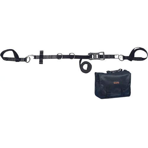Fall safe SAFEWALK LIFELINE standards: EN 795: 2012 B length: 20 m weight: 4.6 kg CHARACTERISTICS: portable horizontal webbing lifeline system with the possibility of regulating the length and tightening the system using a ratchet, a portable bag is included USE: to create an anchor guide for 2 people
