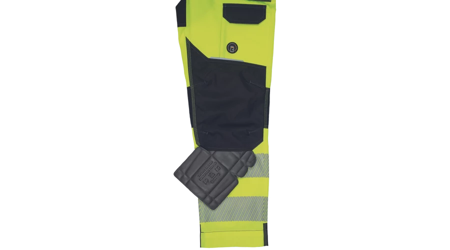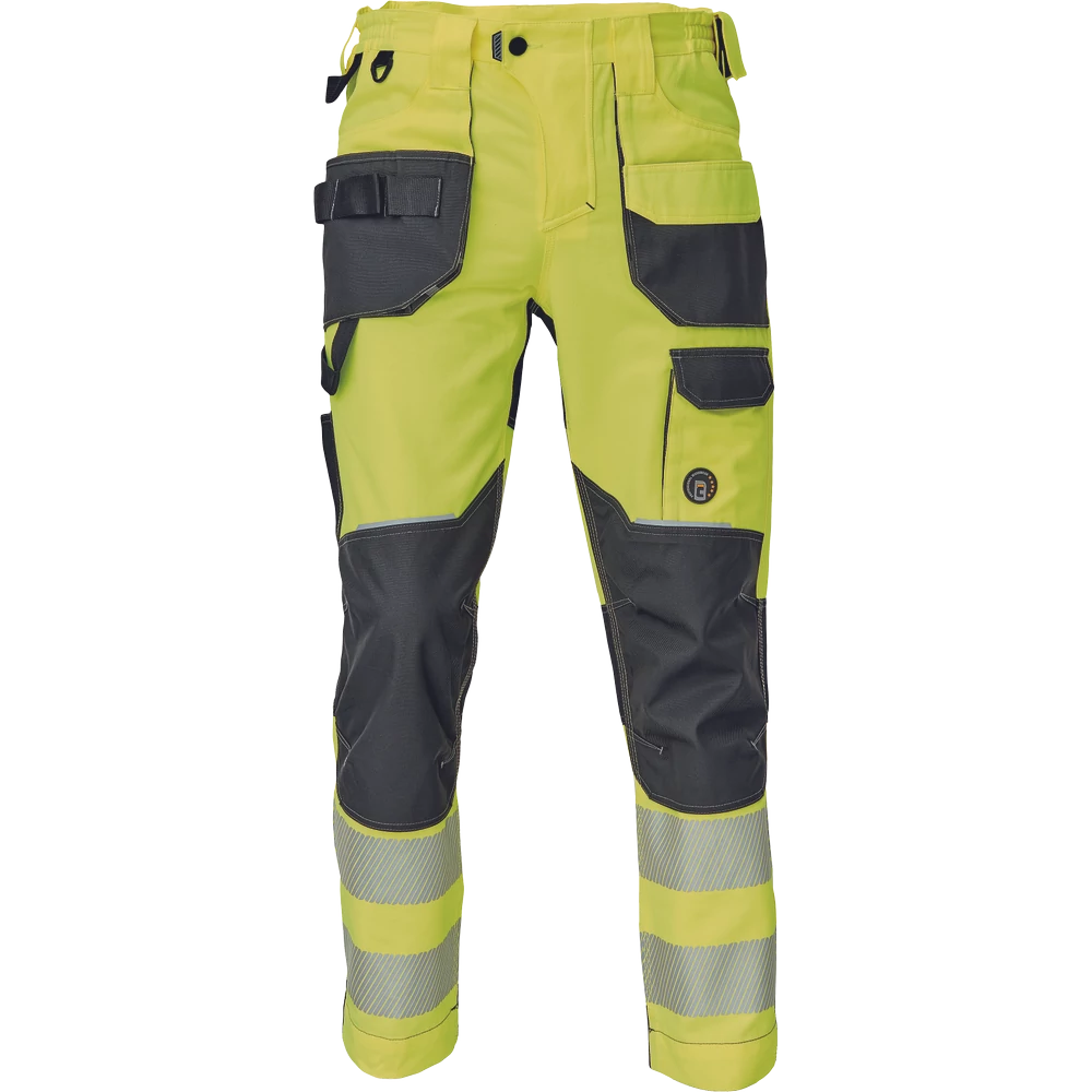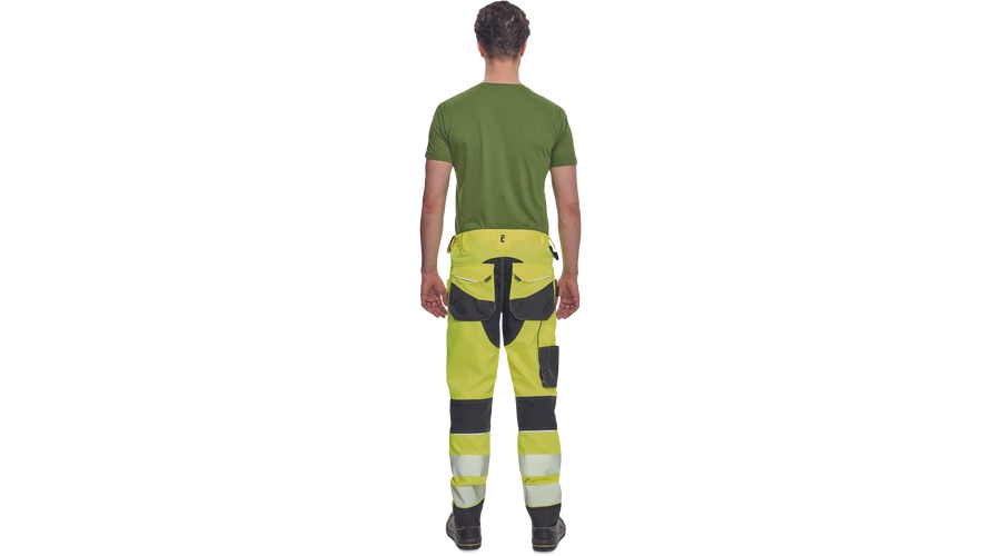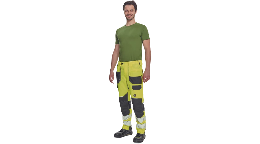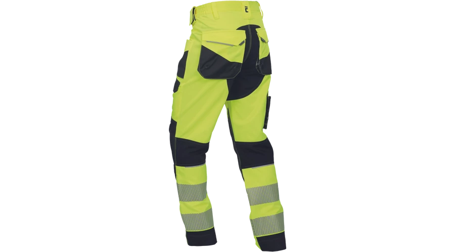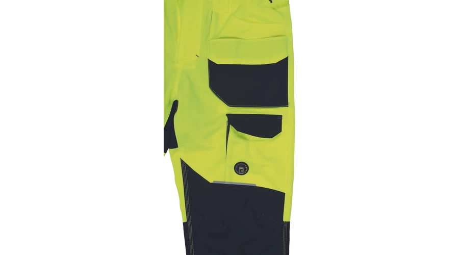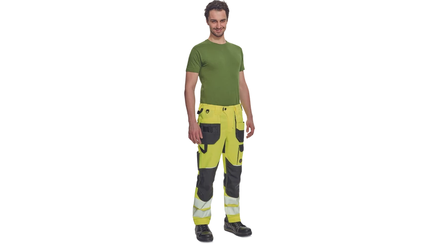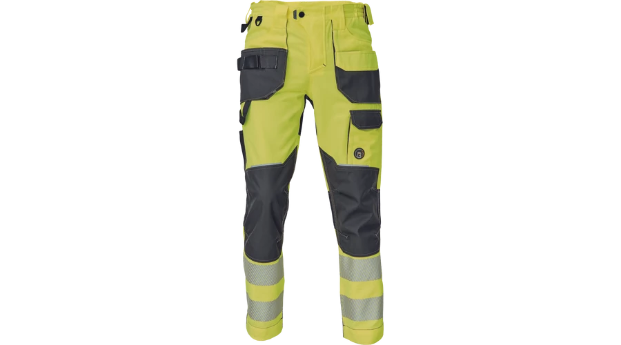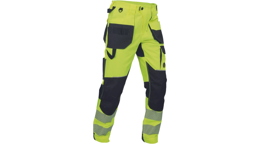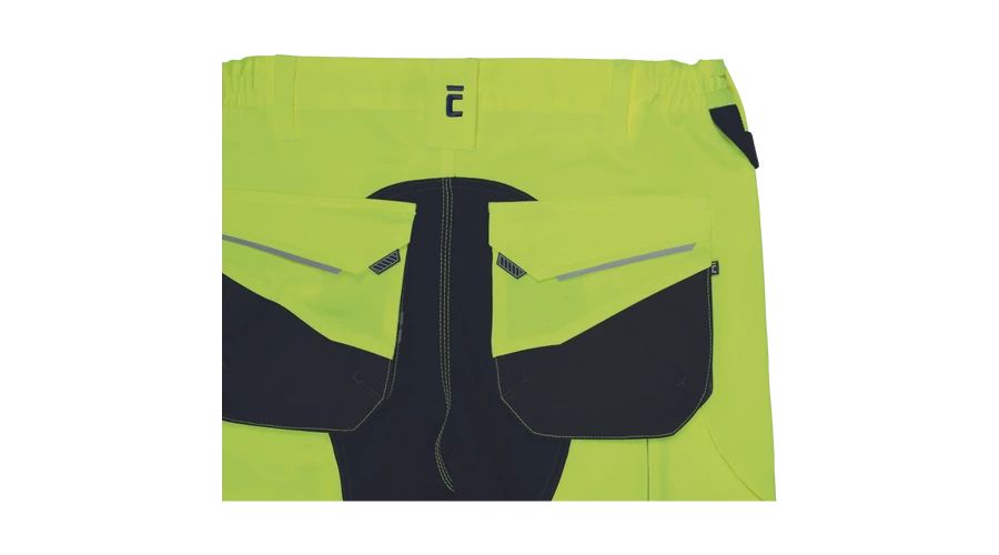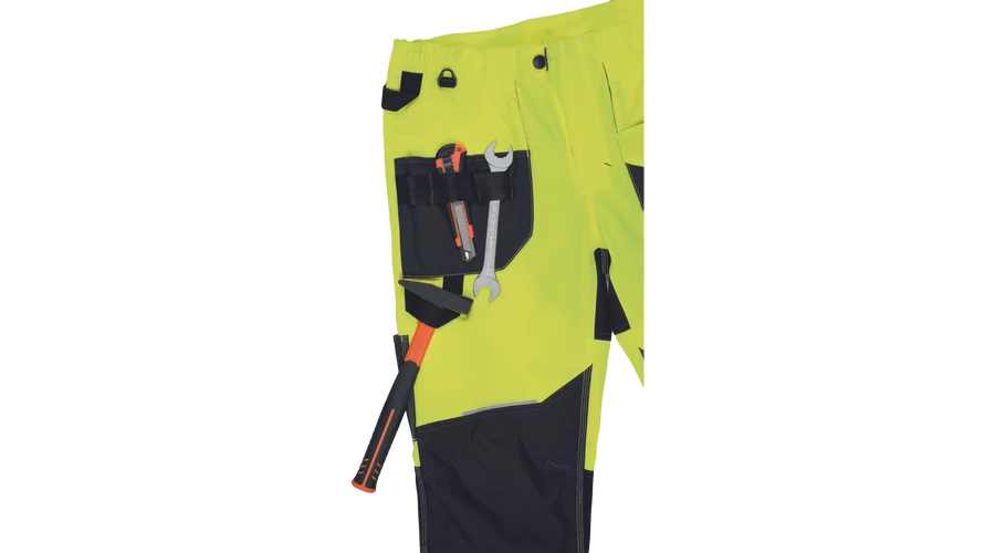 Férfi jólláthatósági nadrág rugalmas derékkal és többfunkciós zsebekkel, 7 cm-es nyomtatott fényvisszavető csíkokkal. Megerősített térdrész és térdzseb Oxford 600D anyagból térdvédő behelyezéséhez. Ellenálló hármas fedőző varrás az üleprészen és a meghosszabbítható szárakon.