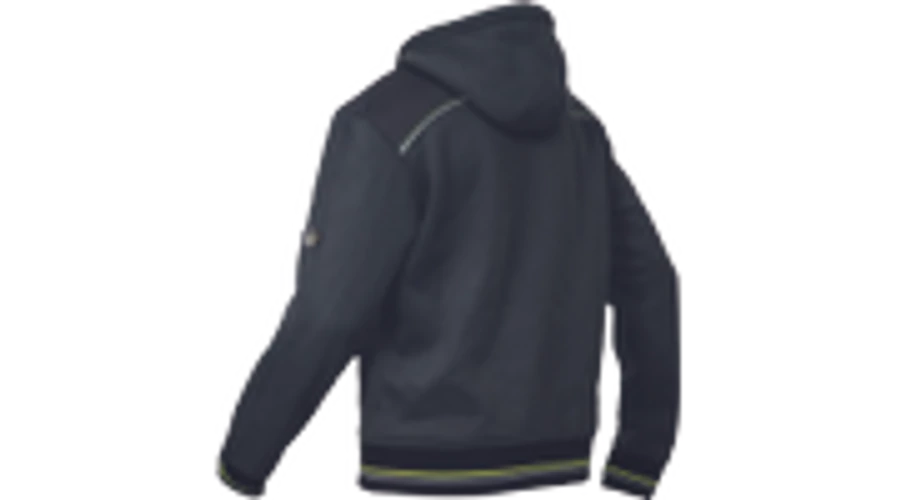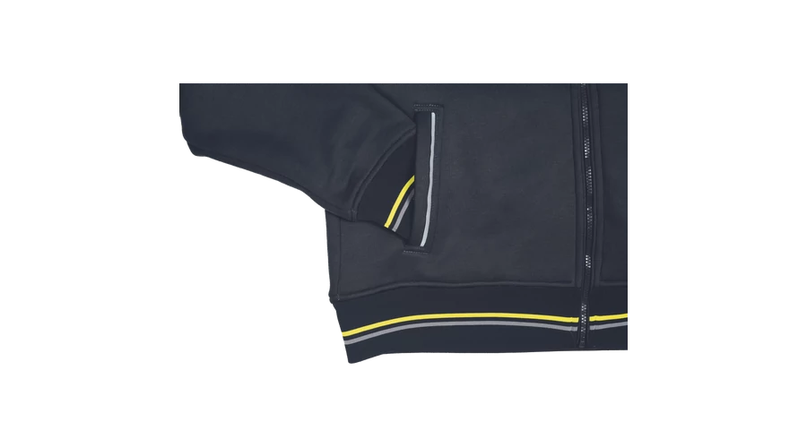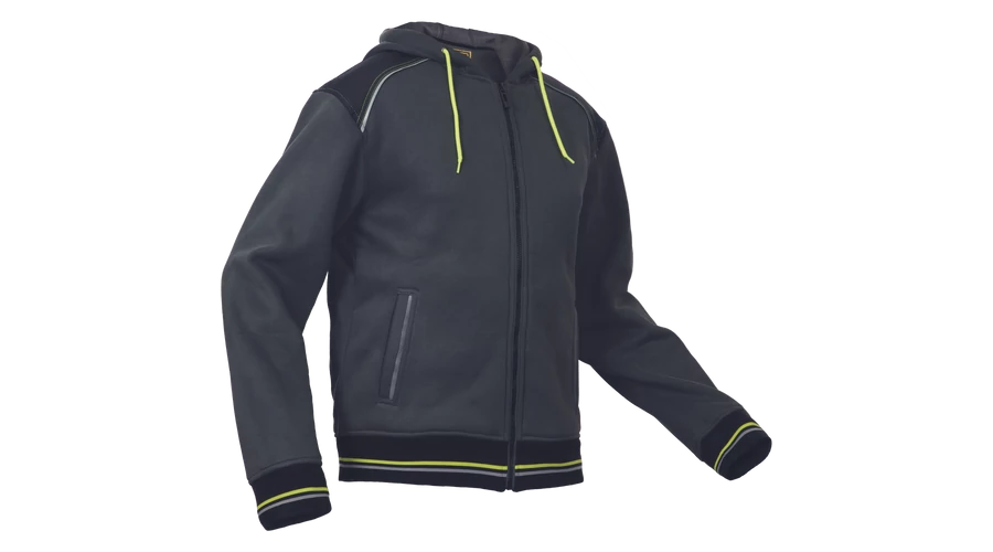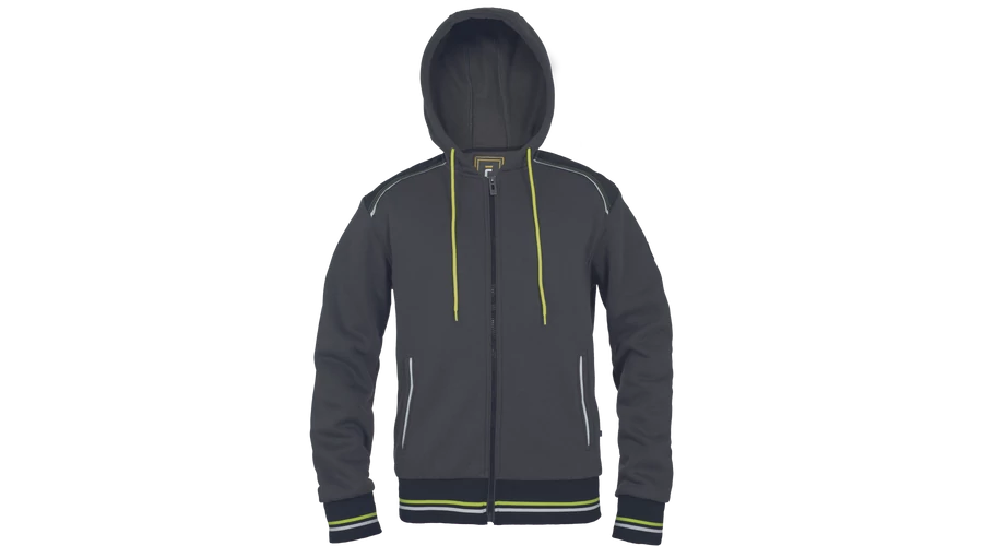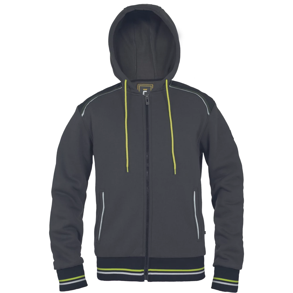 Kevertszálas kapucnis kardigán cipzárral. Bolyhosodásmentes francia frottír szövet belső, fényvisszavető elemekkel díszített oldalzsebek, kétrétegű kapucni, dekoratív tűzések. Rugalmas mandzsetta és alsó szegély.