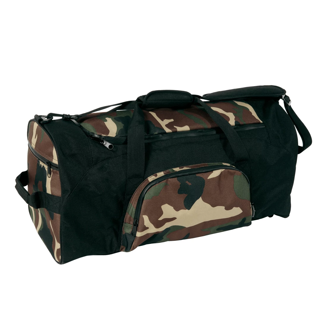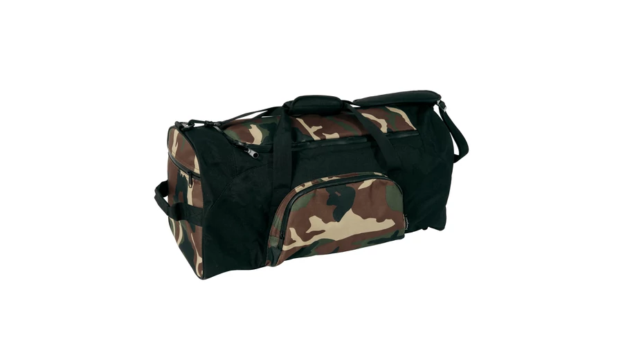 Terepszínű mintás és fekete színű anyagból készült táska, három külső zsebbel és vízálló cipzárra, dupla fogantyúval és állítható vállpánttal. Mérete: 25 x 29 x 60 cm