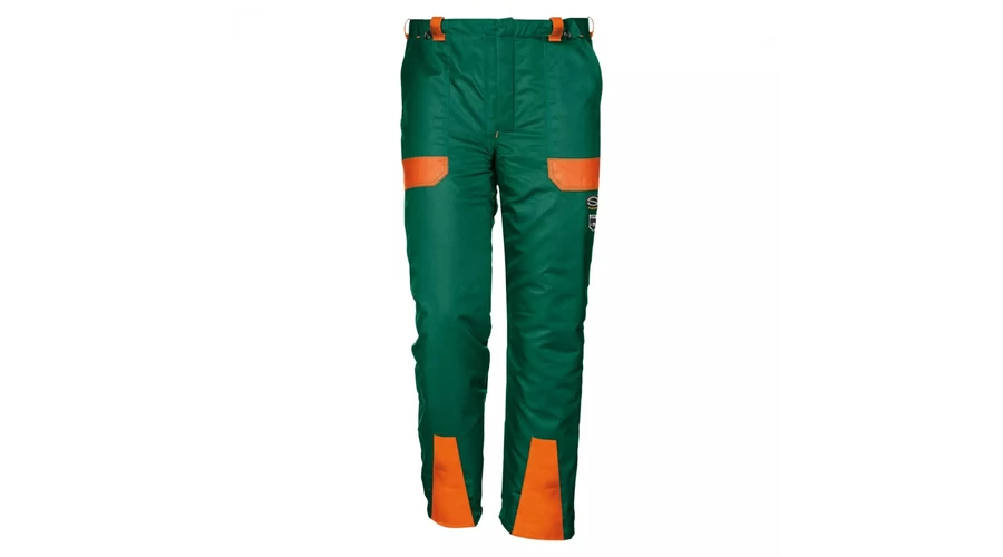 65% poliészter és 35% pamut, 240gr/m2 alapanyagú vágásbiztos derekasnadrág. Láb elülső részén 155gr/m2 PET alapanyagú vágásbiztos betét helyezkedig el. Cipzáros és gombot záródás. Két zseb alsó megerősítéssel. Tépőzáras hátsózseb. 6 darab 3cm övbújtató a derékrészen.